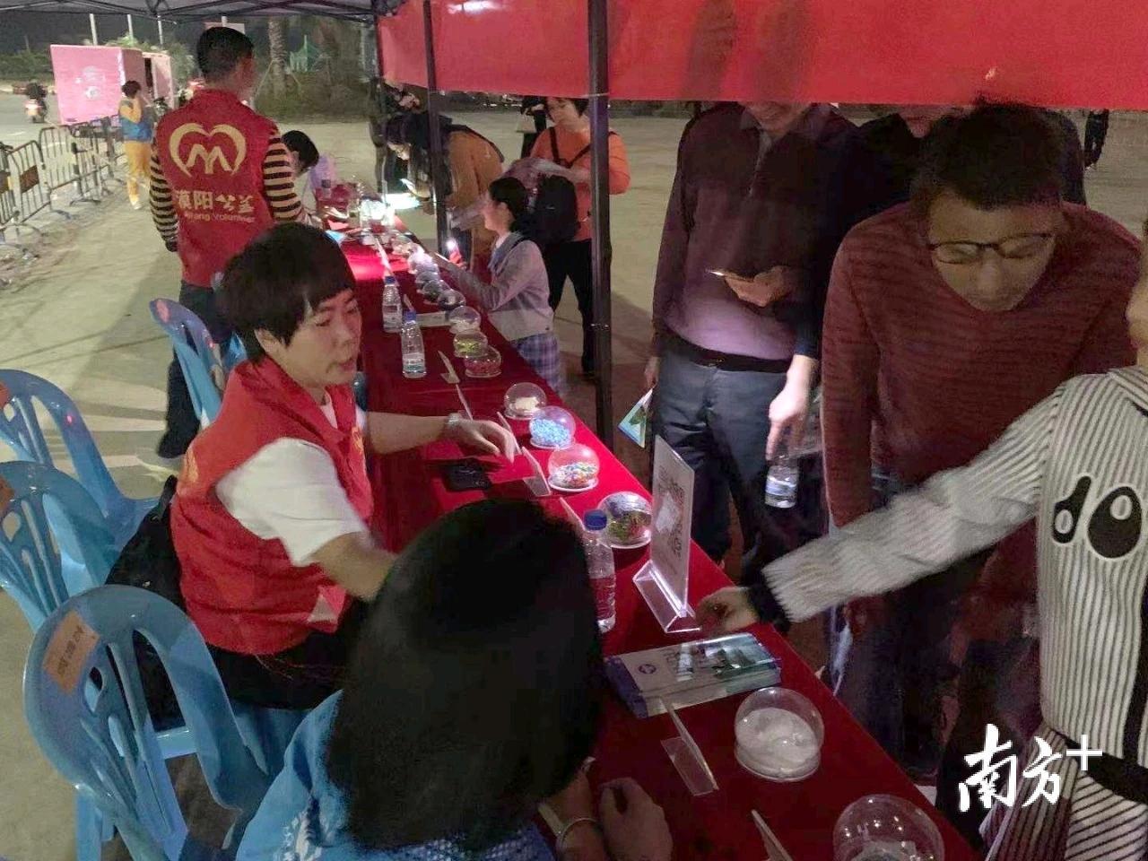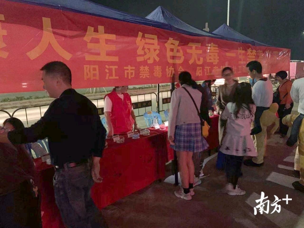 入夜后,前来观看演唱会的歌迷越来越多,禁毒志愿者邀请歌迷关注扫”中国禁毒“、”广东禁毒“、“阳江禁毒“的二维码来了解禁毒的工作与情势,并且指导歌迷进入公众号来学习禁毒科谱知识。