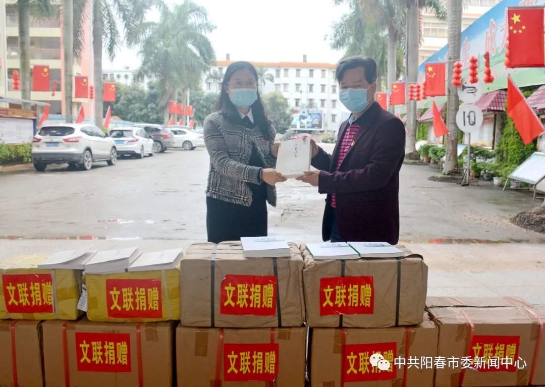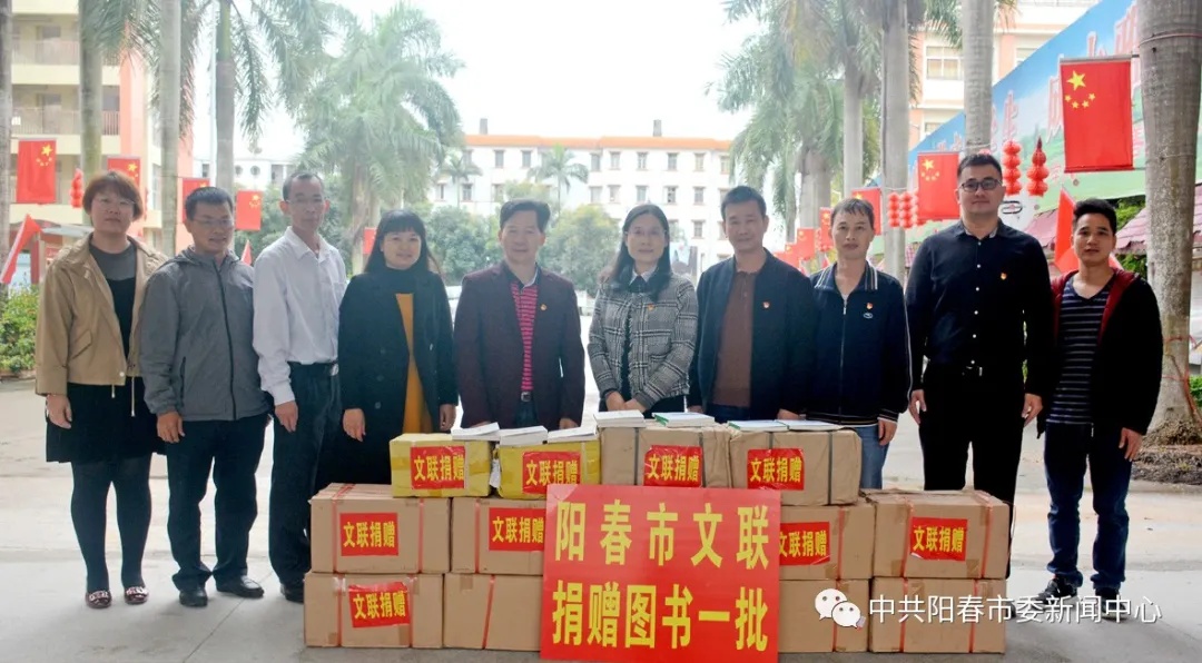 在当天的捐赠仪式上,阳春市文联相关人员向阳春二中赠送了《阳春传奇》、《桃红深处》等课外书籍共3000册。