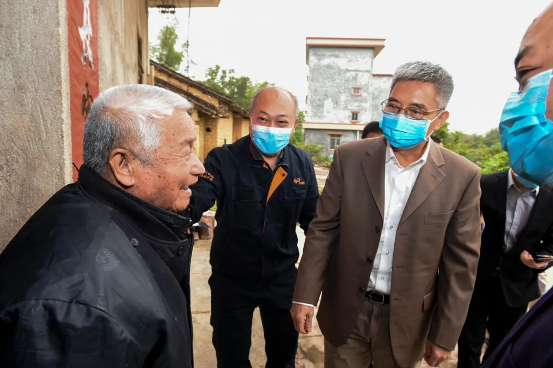 随后,贺禹前往贫困大学生杨飞凤家中,探望她98岁的养父杨才儒。提到“漂流儿”杨飞凤被养父母在河边捡到并抚养成人的故事,大家都很感动,并对杨才儒夫妇的爱心表示钦佩。2016年,刚考上大学的杨飞凤,因家庭困难准备放弃学业照顾病重的母亲。阳江核电和中广核驻村工作组获悉后,第一时间伸出援手,帮助她顺利入学。2019年毕业后,杨飞凤在佛山一家酒店工作,现已担任主管。贺禹询问了老人的生活、身体情况,并送上慰问品,祝福老人健康长寿。