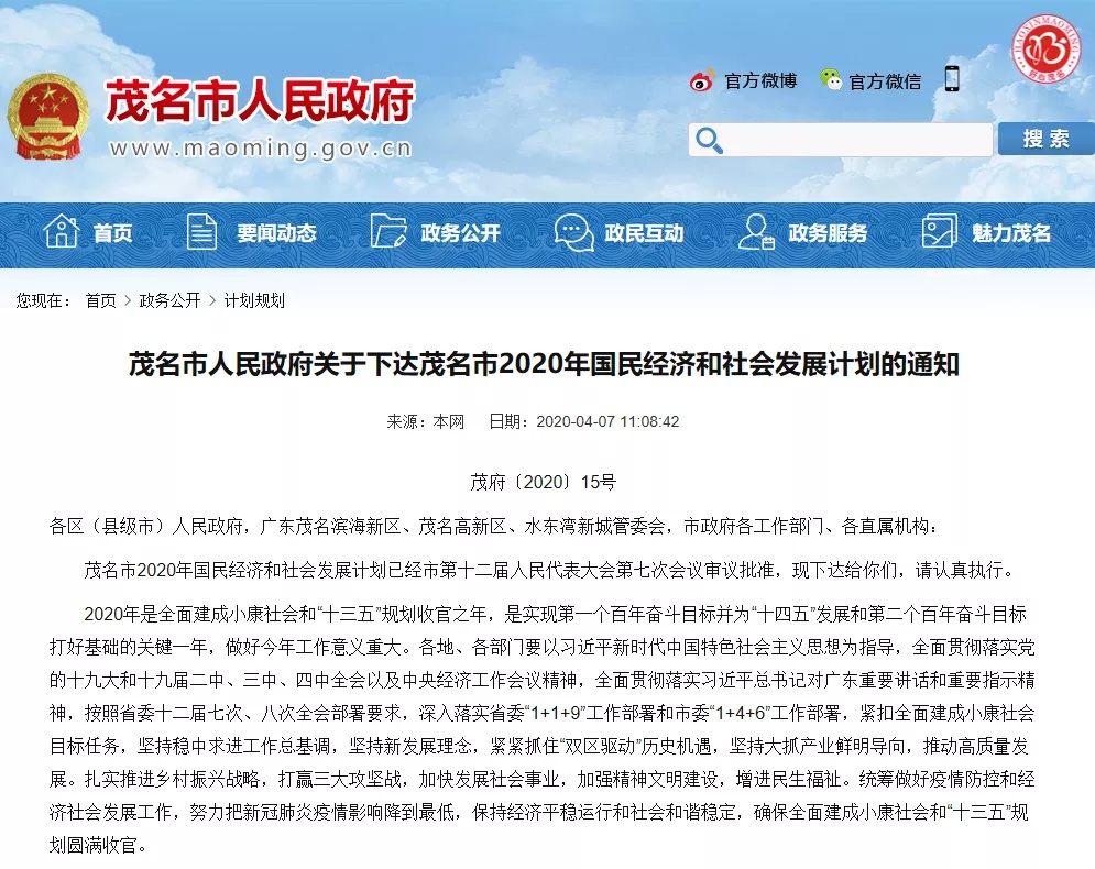 4月7日,茂名市人民政府网发布《茂名市人民政府关于下达茂名市2020年国民经济和社会发展计划的通知》。
