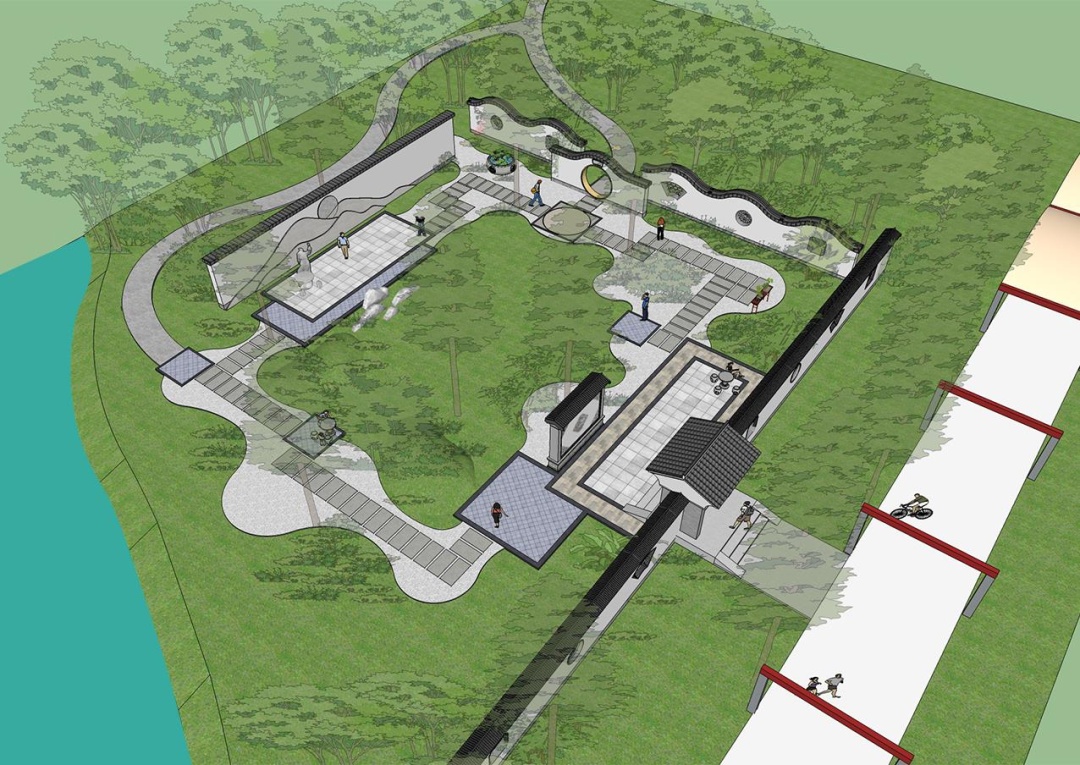 曲线形的铺装如河川,以月洞门比明月