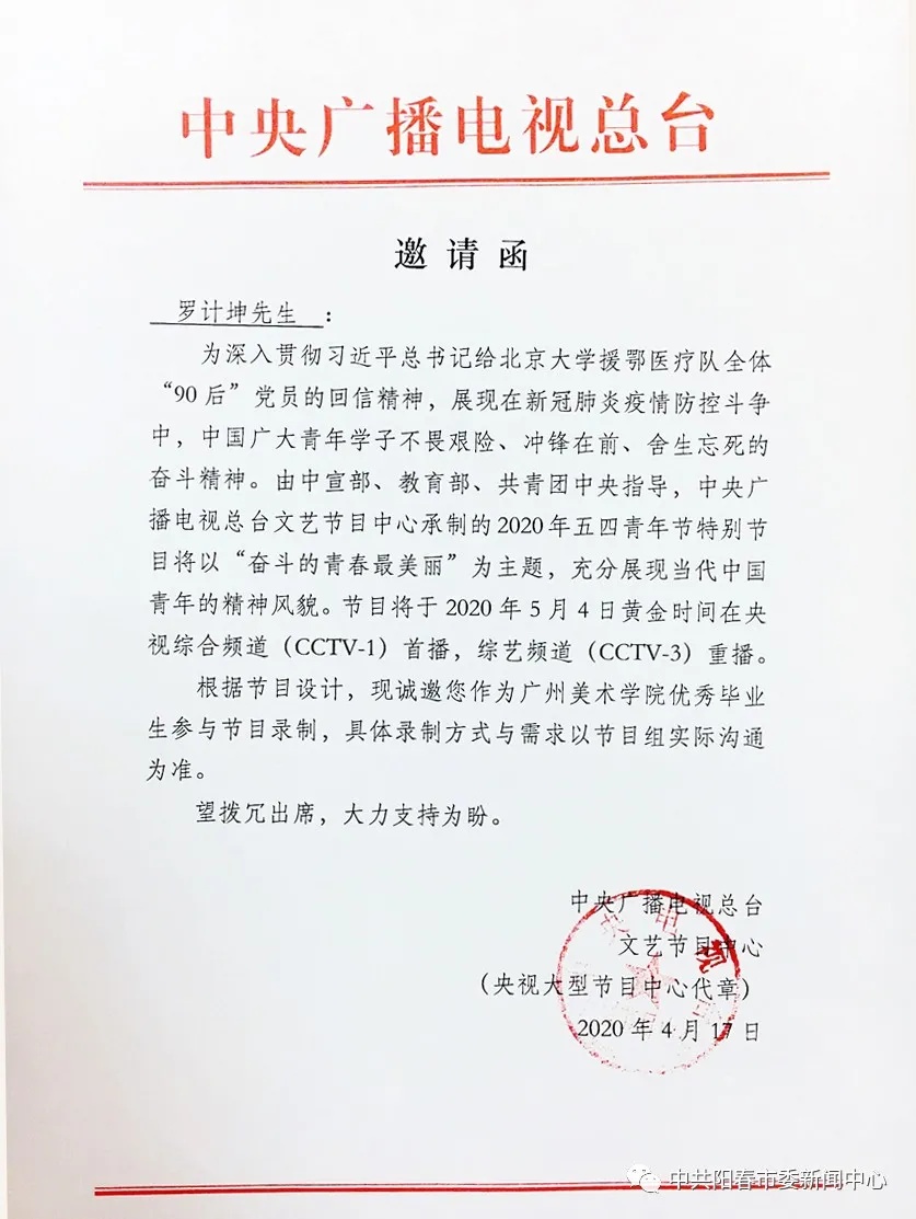 由阳春市籍青年画家罗计坤主创的插画《中国抗疫图鉴》,最近在人民日报微众平台等媒体推出后引起了广大读者的强烈发响。近日,中央广播电视总台文艺节目中心向罗计坤发出邀请函,特邀他参加与“奋斗的青春最美丽”为主题的五四青年节特别节目录制。