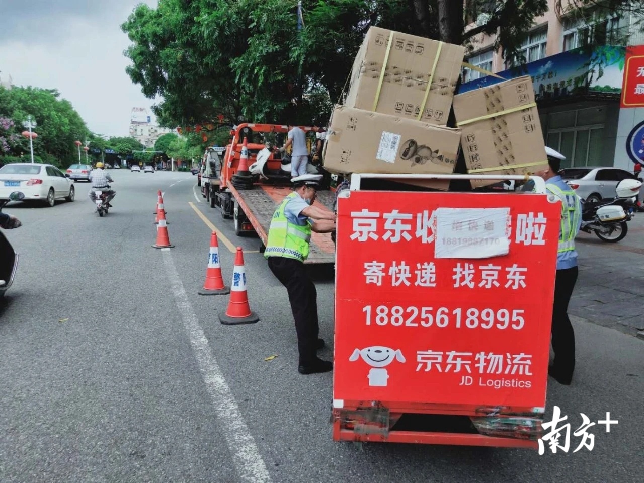 一辆“京东物流”快递车辆没按规定悬挂号牌。