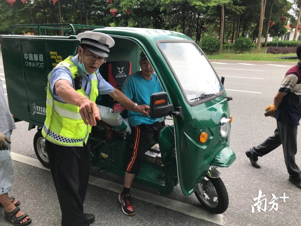 一辆“邮政快递”车辆驾驶员没按规定佩戴安全头盔。