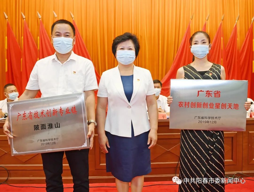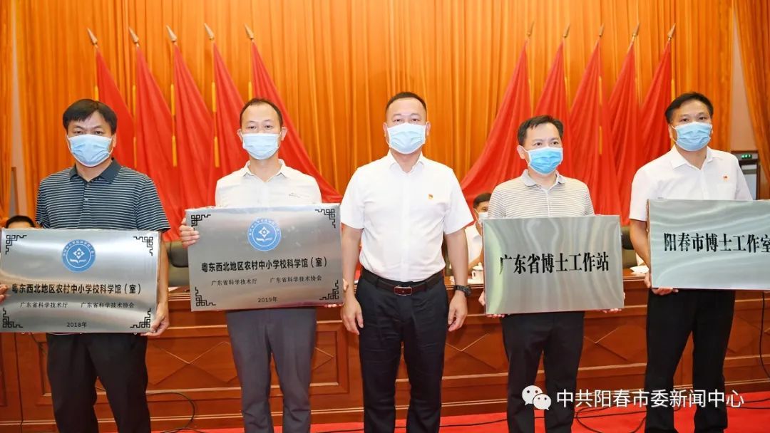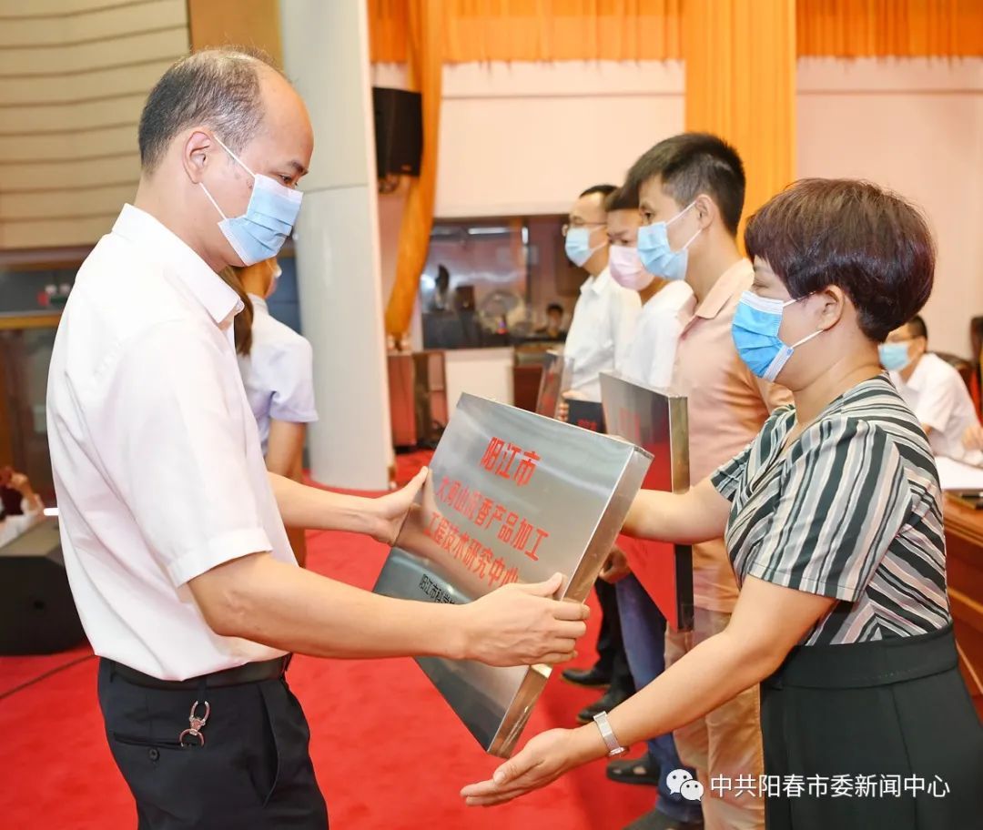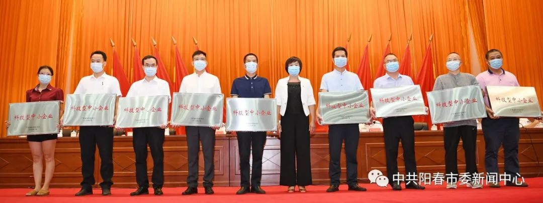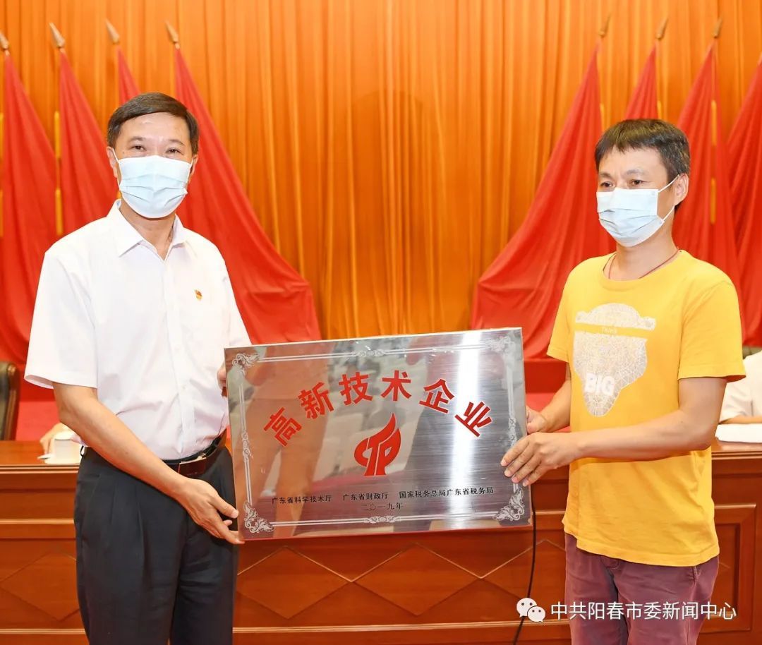 阳春市领导陈平、李宗瑞、余秀坤、陆雪、黄华记、陈希怀、陈华清为阳春市2019年度荣获国家、省、阳江市高新技术企业,广东省工程技术研究中心,科技型中小企业等9类共28家企业、机构授牌。