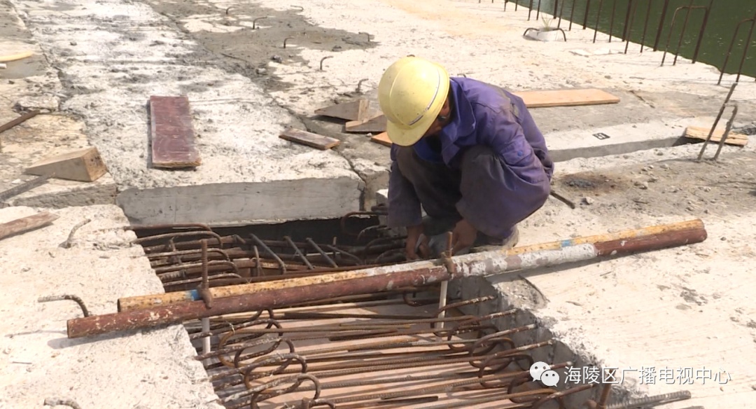 上午,记者来到施工现场,只见工人们正在对桥面系的缝隙进行钢筋衔接、钉模板,然后浇灌混凝土等。
