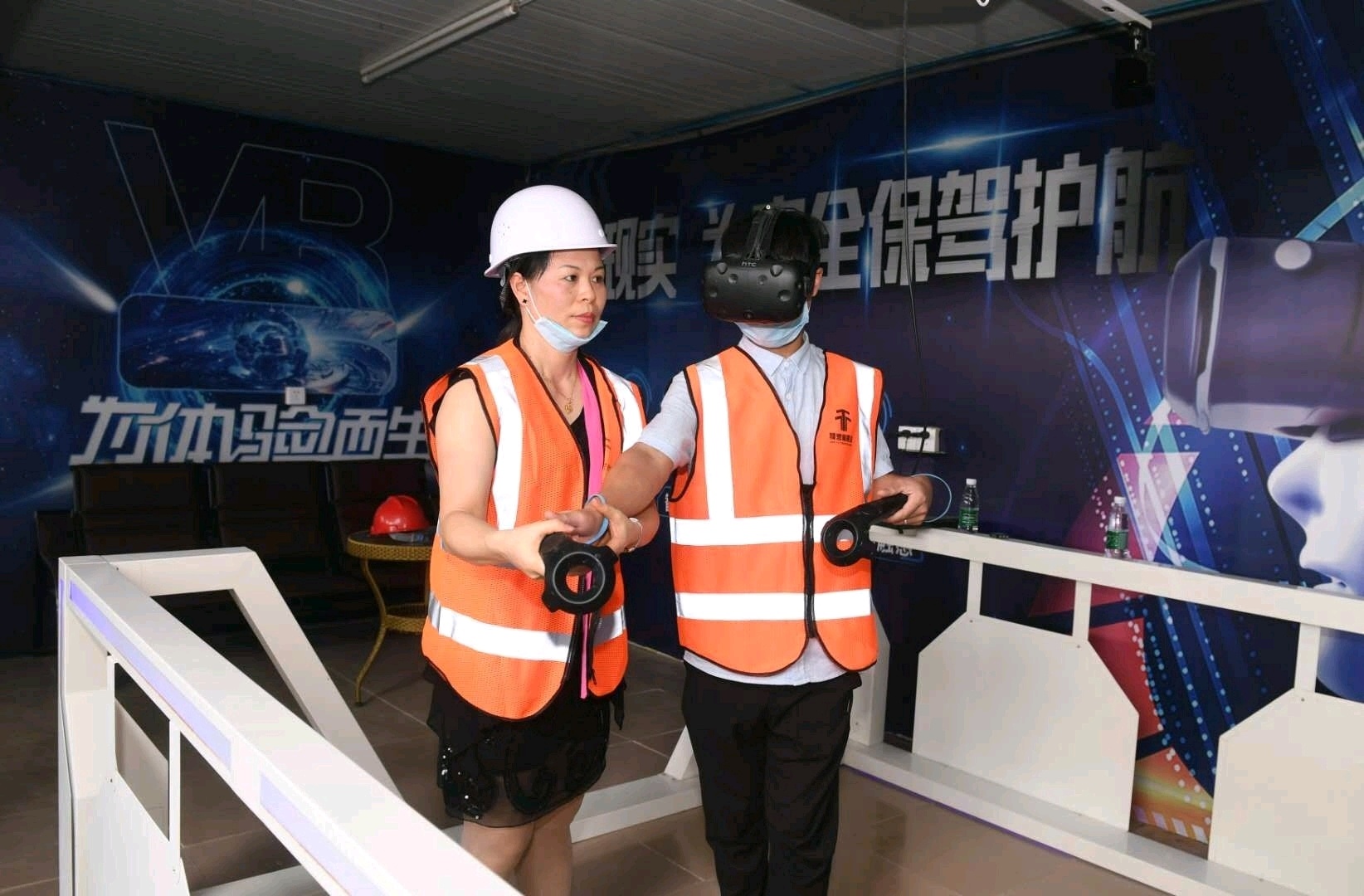 继续深入工地,到达安全体验区,各类安全体验设施尽展眼前,安全防护措施具化到每项设备上。防毒面具、安全帽、焊接面罩、焊工手套、劳保服、安全鞋、安全带、绝缘雨鞋……安全防护用品展区中央,人形模特全副武装,从头至脚展示了进入施工区域的“装备”。