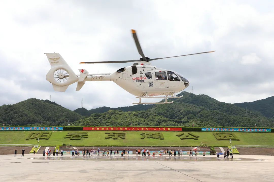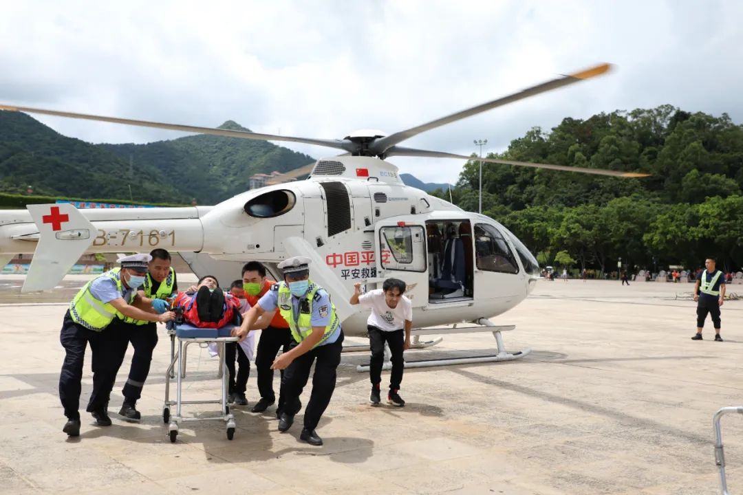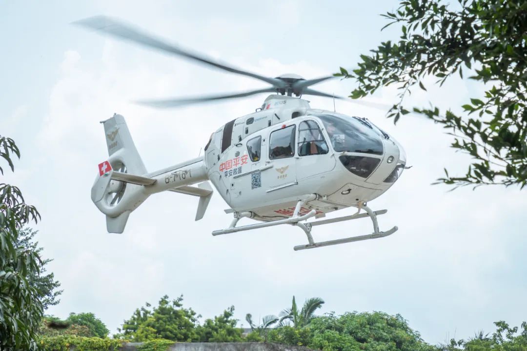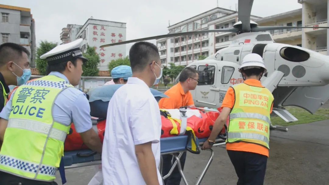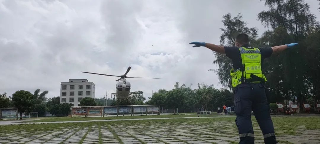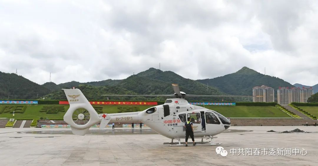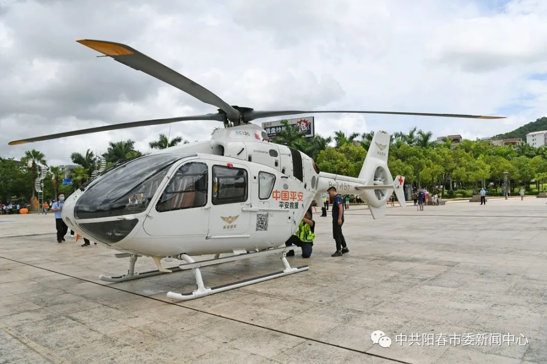 8月汛期,受大雨影响山体滑坡、交通受阻,在八甲镇中心小学内备勤的东部通航“平安救援”直升机紧急启动,机上随行医护人员对伤者判断,伤者骨外伤+疑似脏器损伤已昏迷,情况危急,需紧急转运至50多公里外的阳春市人民医院,符合直升机救援条件,5分钟后,伤者被平稳移送上直升机后立即起飞。