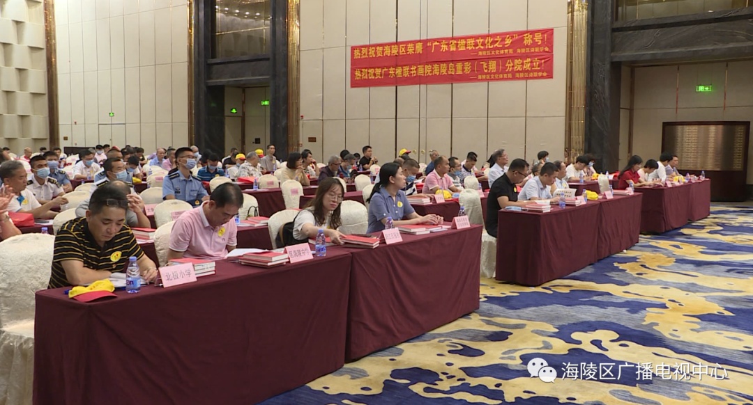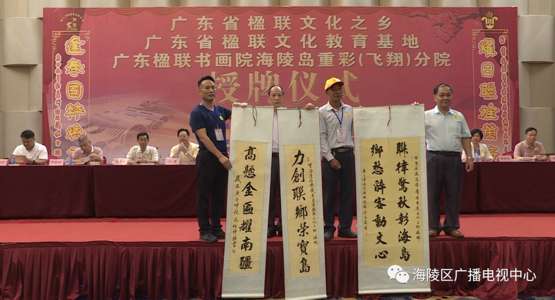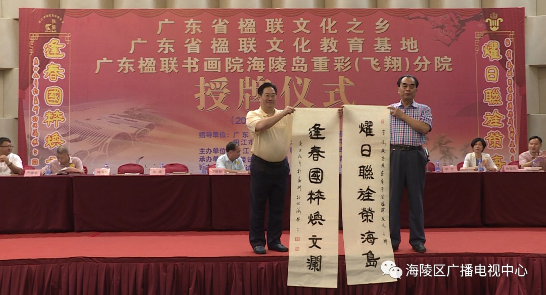 “联坛焕彩,陵岛生辉”。海陵区荣获“广东省楹联文化之乡”、“广东省楹联文化教育基地”暨“广东楹联书画院海陵岛重彩(飞翔)分院”成立授牌仪式,9月22日上午在皇冠假日酒店举行。