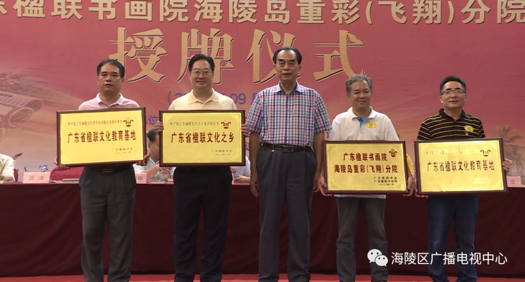 授牌仪式上,邹继海为海陵区颁授“广东省楹联文化之乡”牌匾;给海陵中学、北极小学颁授“广东省楹联文化教育基地”牌匾,并颁授了“广东楹联书画院海陵岛重彩(飞翔)”分院牌匾。