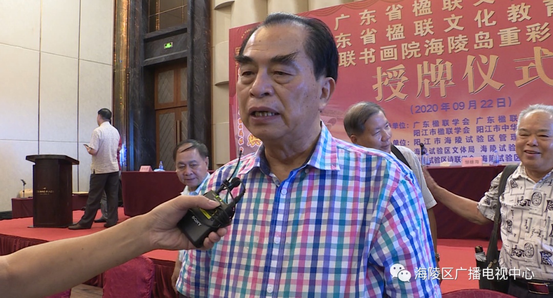 广东省楹联学会会长 邹继海:海陵的文化通过旅游资源文化和历史文化综合起来,体现我们海陵综合的形象,让大家来这里能够学习暨能看到美好的风光,又了解海陵的历史,尤其是通过书画、摄影、诗词、楹联等文化来展示,我们海陵资源很丰富、很丰厚的,让人家来到海陵感受了自然风也感受了一种文化的教育,让我们的旅游文化更有底气了。