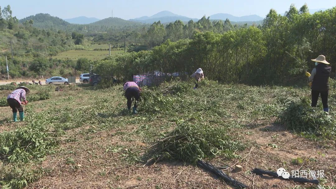 在阳西县新农庄南药种植产业扶贫项目的种植基地,工人们有的在用机器锯断三叉苦根部,有的在修理树枝,有的在挑拣装车,现场一片丰收景象。项目有关负责人表示,该基地种植了100多亩南药三叉苦,每亩有400多棵,每棵重约60-70公斤,由于阳西土壤、气候等条件因素特别适合种植南药,所以出产的三叉苦品质很高。