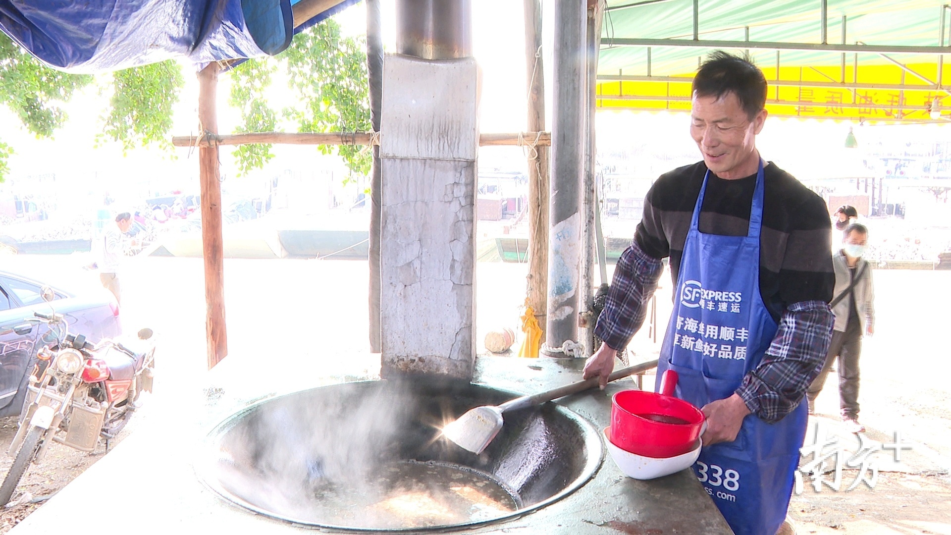 蚝农蓬叔正在熬制蚝油。