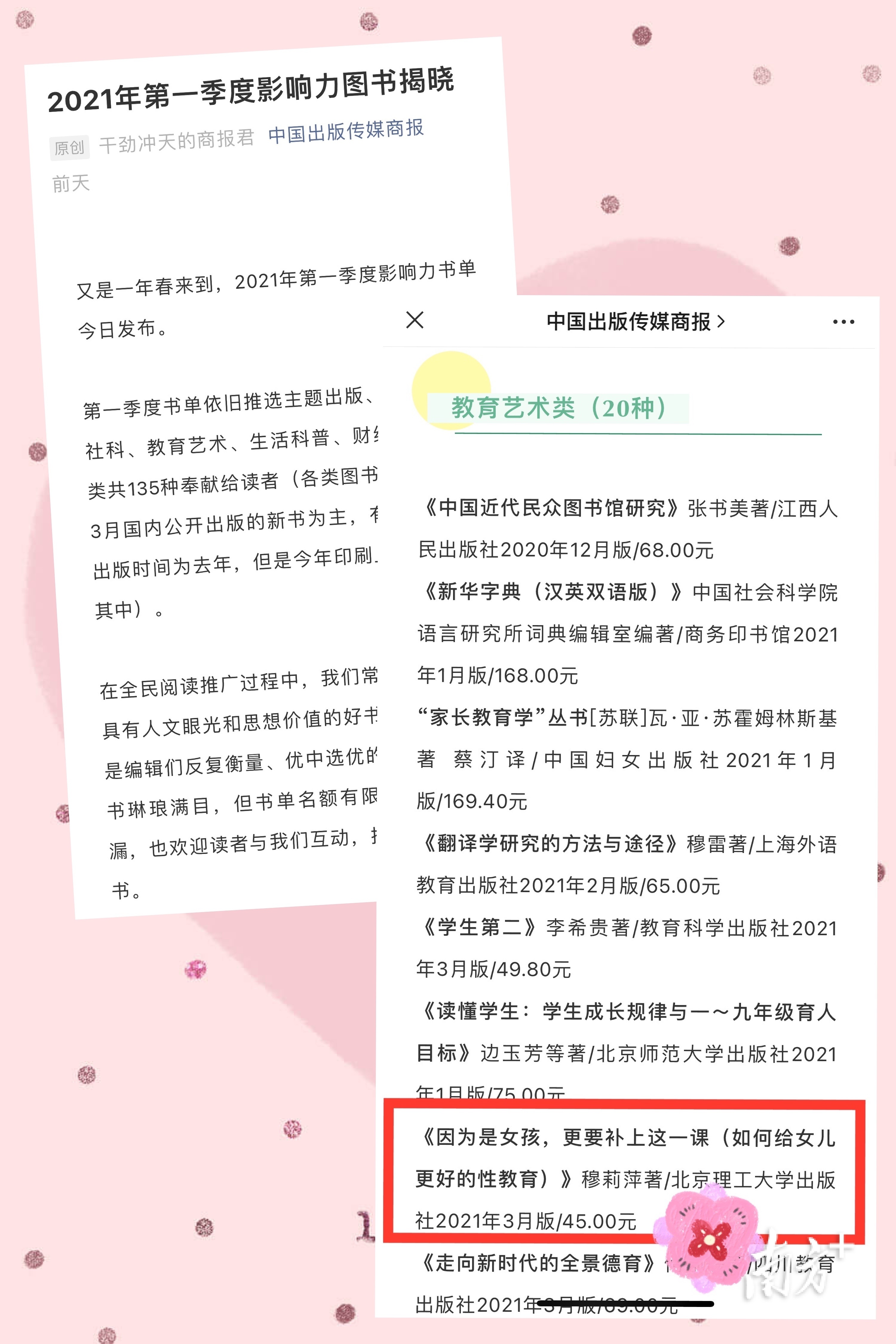 在4·23世界读书日到来之际,由阳江女检察官穆莉萍撰写的新书传来好消息。前日,中国出版传媒商报公众号发布今年第一季度影响力书单,其中,《因为是女孩,更要补上这一课(如何给女儿更好的性教育)》在全国众多教育艺术类图书中脱颖而出,榜上有名!而这本新书,正是由南方+首次推荐,并第一时间对作者进行了独家专访。