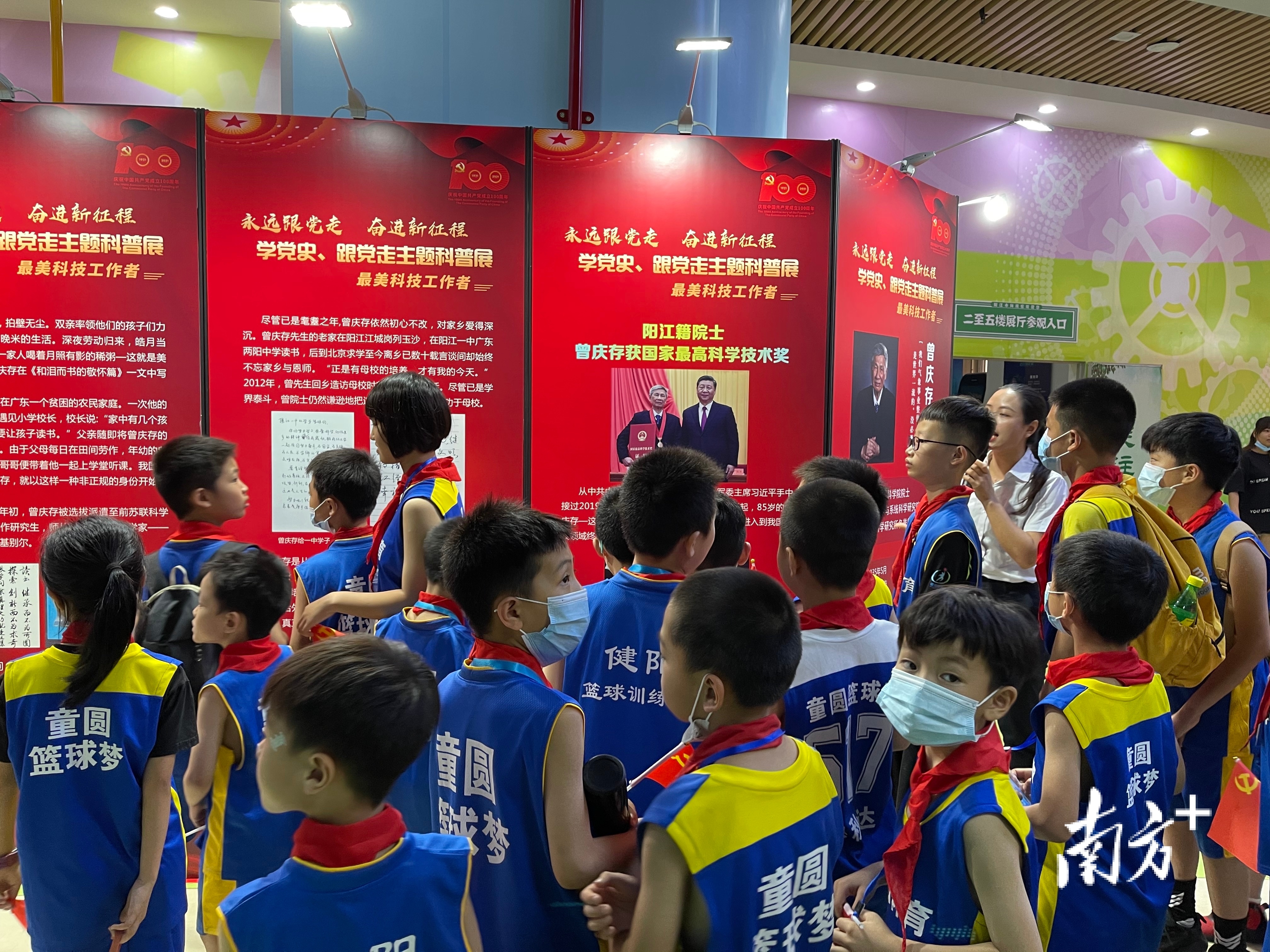 活动摆放了长长的党史展板,内容丰富,分为“百年回眸”“百年掠影”“百年变迁”“党的好儿女”“追寻红色印迹”“童心向党学热词”六大板块。前三个板块从历史节点、重大事件、人事变迁层面描绘党与人民心连心、同呼吸、共命运的百年宏卷;后三个板块从榜样人物、红色记忆、时代热词角度激励全党全社会以昂扬姿态奋力开启全面建设社会主义现代化国家新征程。现场还设置了道德模范专题展板,宣传最美科技工作者的感人事迹,为孩子们树立学习榜样,引导孩子们奋发学习,树立正确的人生观。