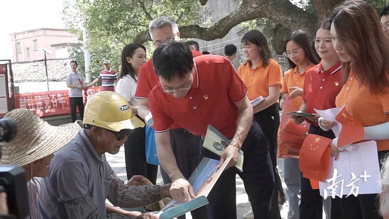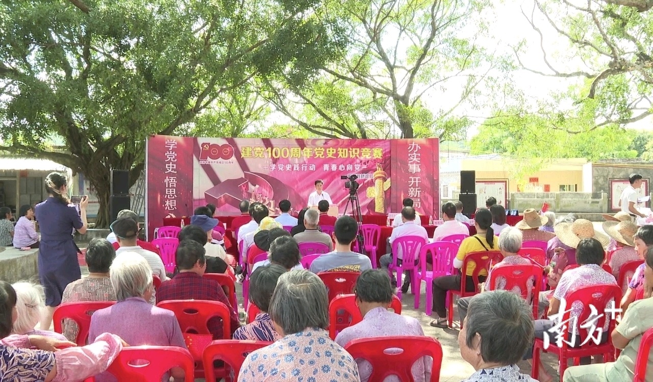 “老同志,我们的党史课马上就要开始了,您先找个位置坐好。”阳西县财政局的党员志愿者一边准备上课用的桌椅,一边招呼着大家。不一会儿,偌大的广场便坐满了人,平南村的党员群众和财政局党员干部坐在一起听党课。