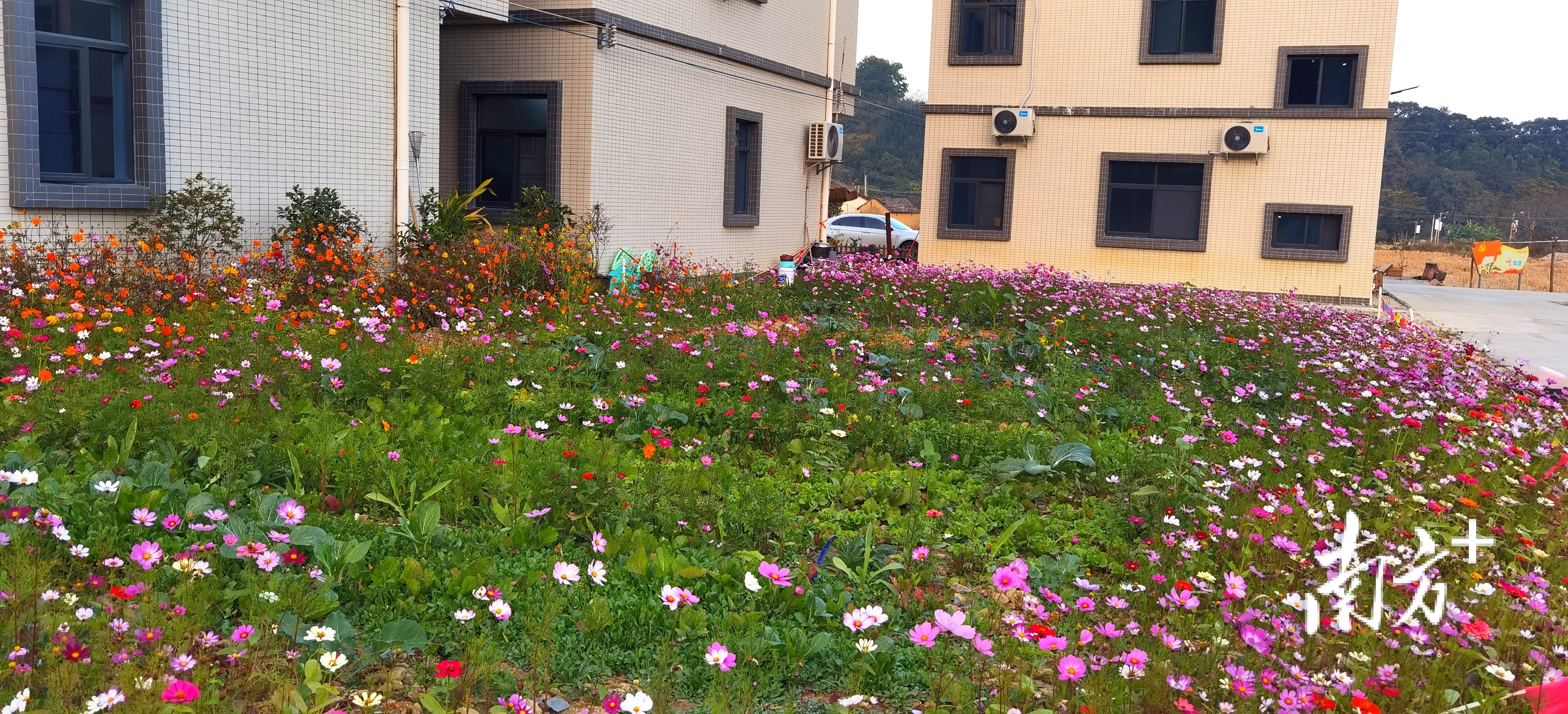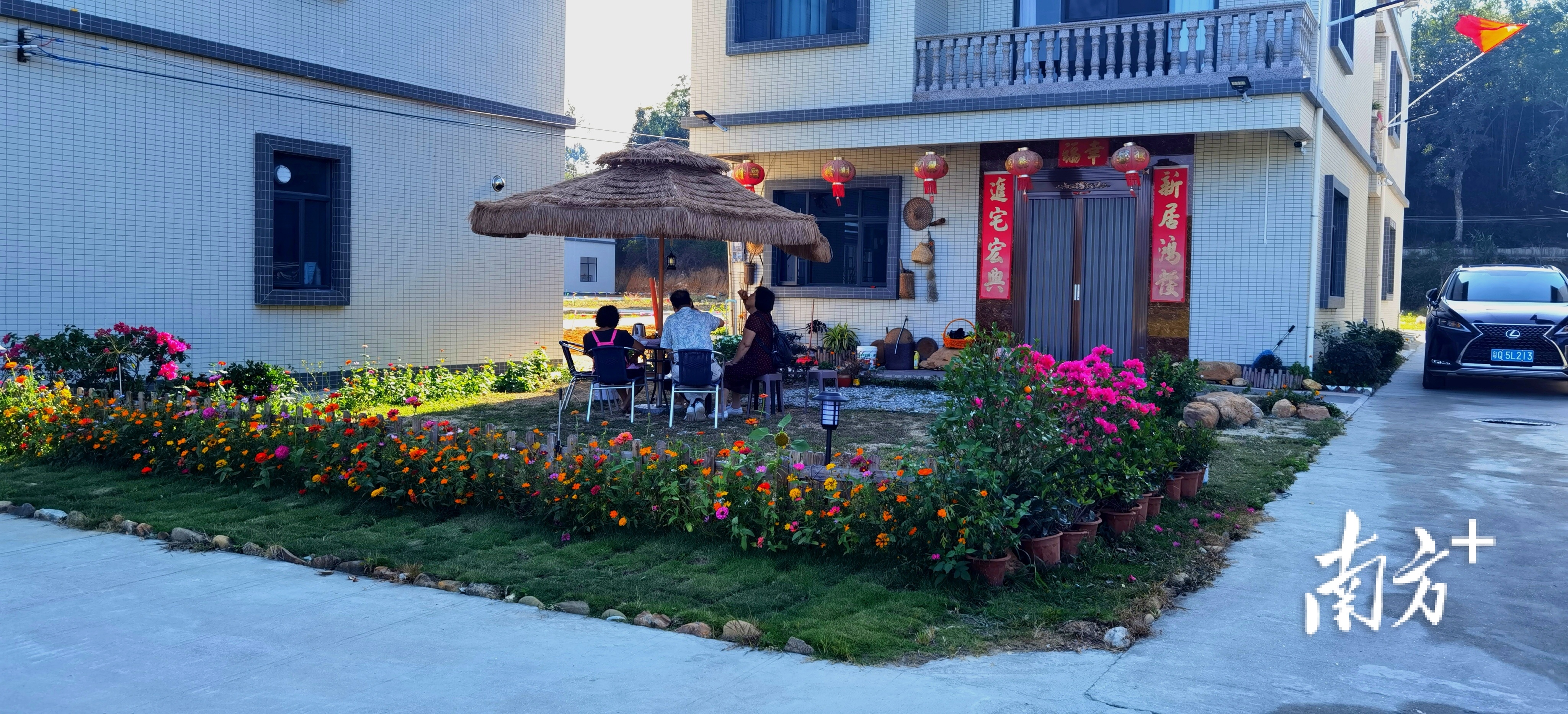 说罢,同行者翻到一张村里的旧照。拿起一看,同一视角、不同时间,曾经土房破损、泥路坑洼,如今洋楼矗立、巷道整洁。走进村子,一排排岭南特色村居坐落有序,庭前院内处处点缀着繁花绿草,无一不令人心旷神怡。