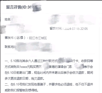群里有人自称是“票务人员”,有“内部渠道”可以帮忙购买演唱会门票。在添加对方好友后,陈女士根据对方指引支付门票费用。在规定日期内,对方却并未寄出门票,并以各种理由逾期退款。这时陈女士才意识自己被骗,于是报警求助。