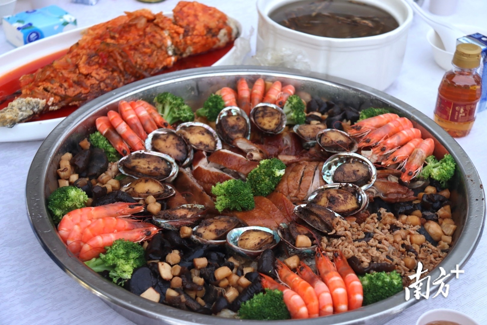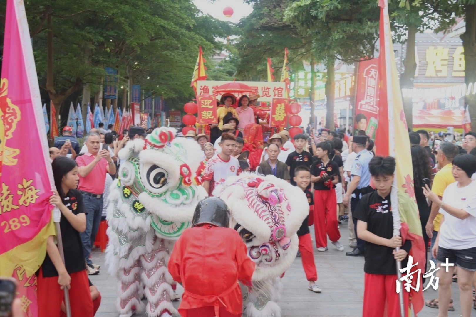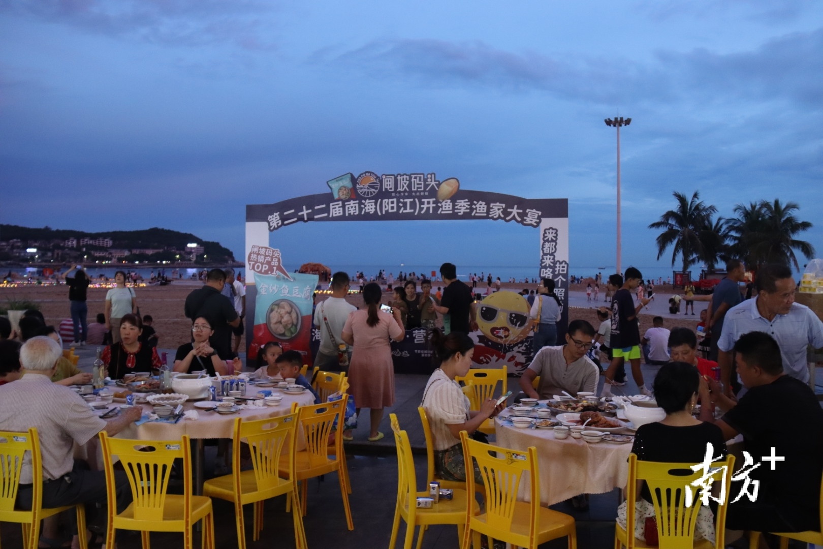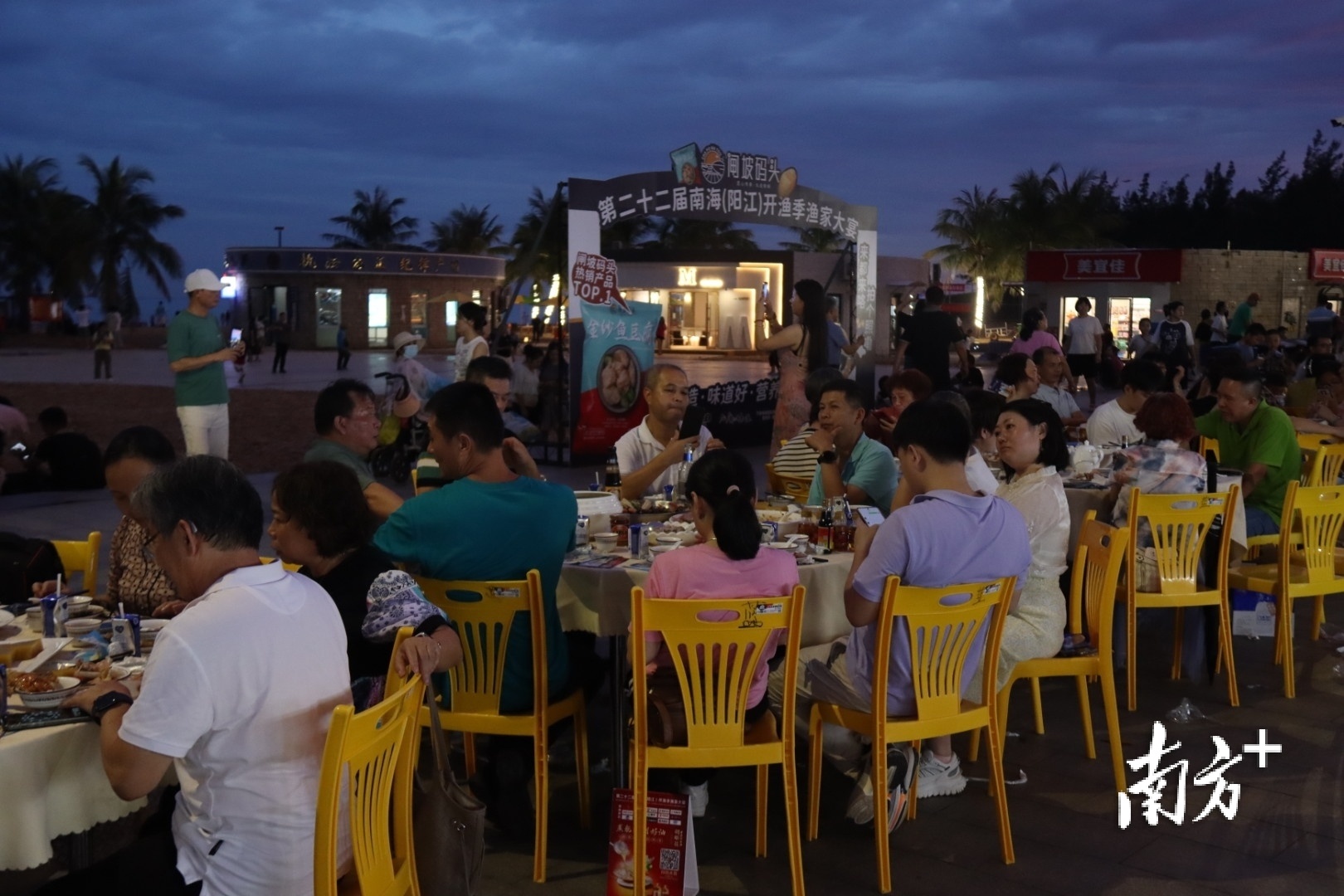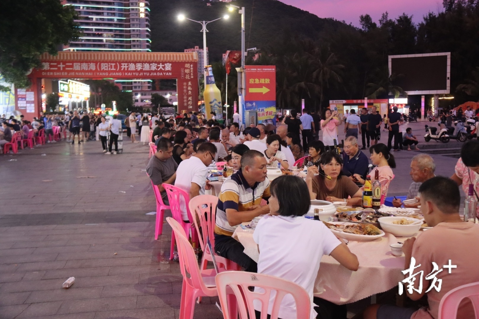 这是第二十二届南海(阳江)开渔季系列活动“重头戏”之一的渔家大宴的现场:街道两边,千桌宴席,聚集近万名来自五湖四海的朋友,一边品尝渔家大宴,一边观赏疍家婚嫁民俗表演活动,共享开渔喜庆。