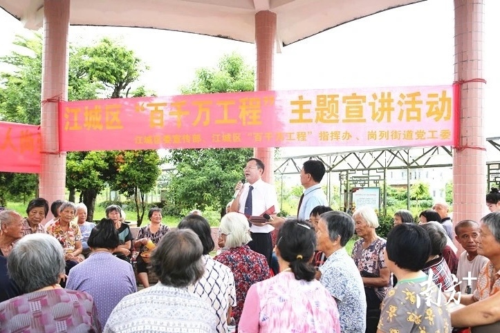 “每当傍晚时分,岗列街道四围村过路围村入村口的水泥村道和活动平台处,总会聚集着许多饭后散步、下棋锻炼的村民,而在半年前,这一带却是饱受村民诟病的‘烂泥盆地’和‘臭沟黑河’结合体……”通过讲阳江“讲古仔(故事)”的方式,百姓宣讲员让枯燥的文字变得生动活泼。