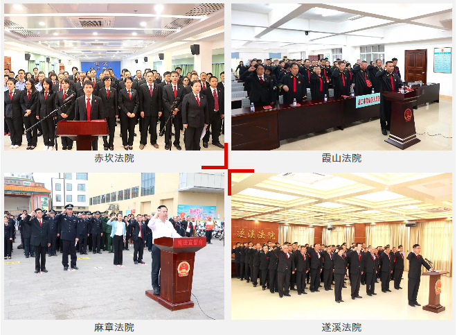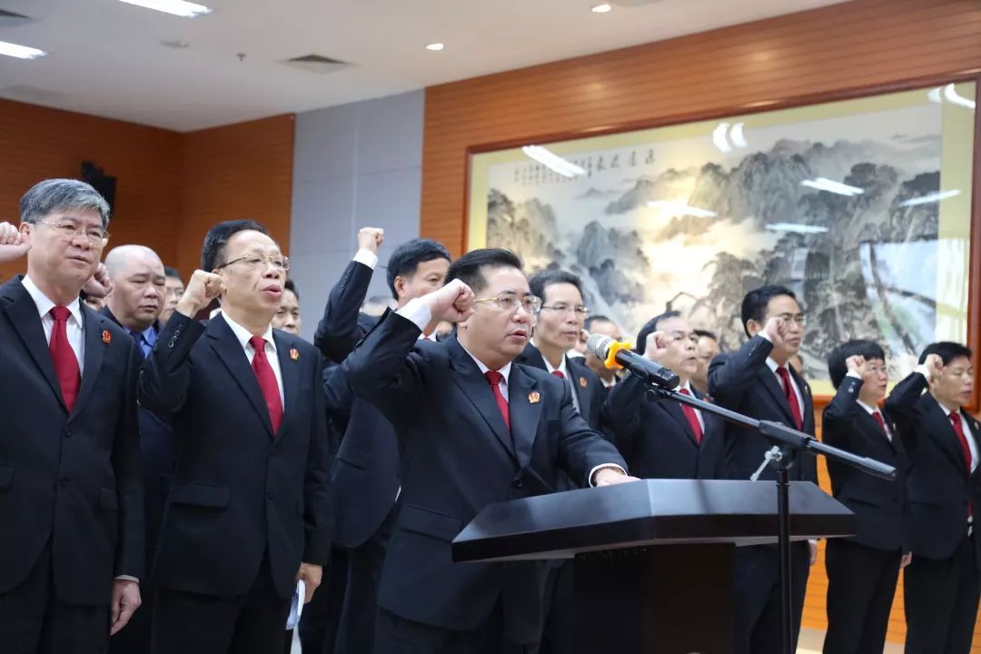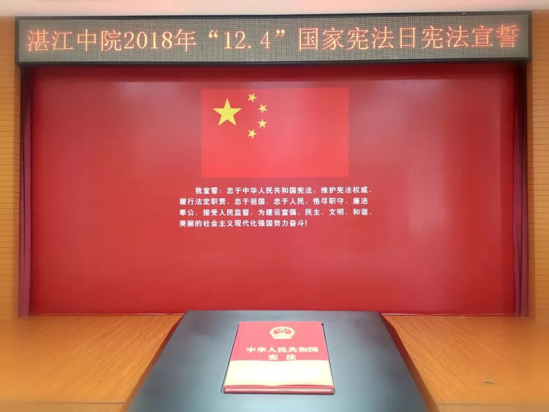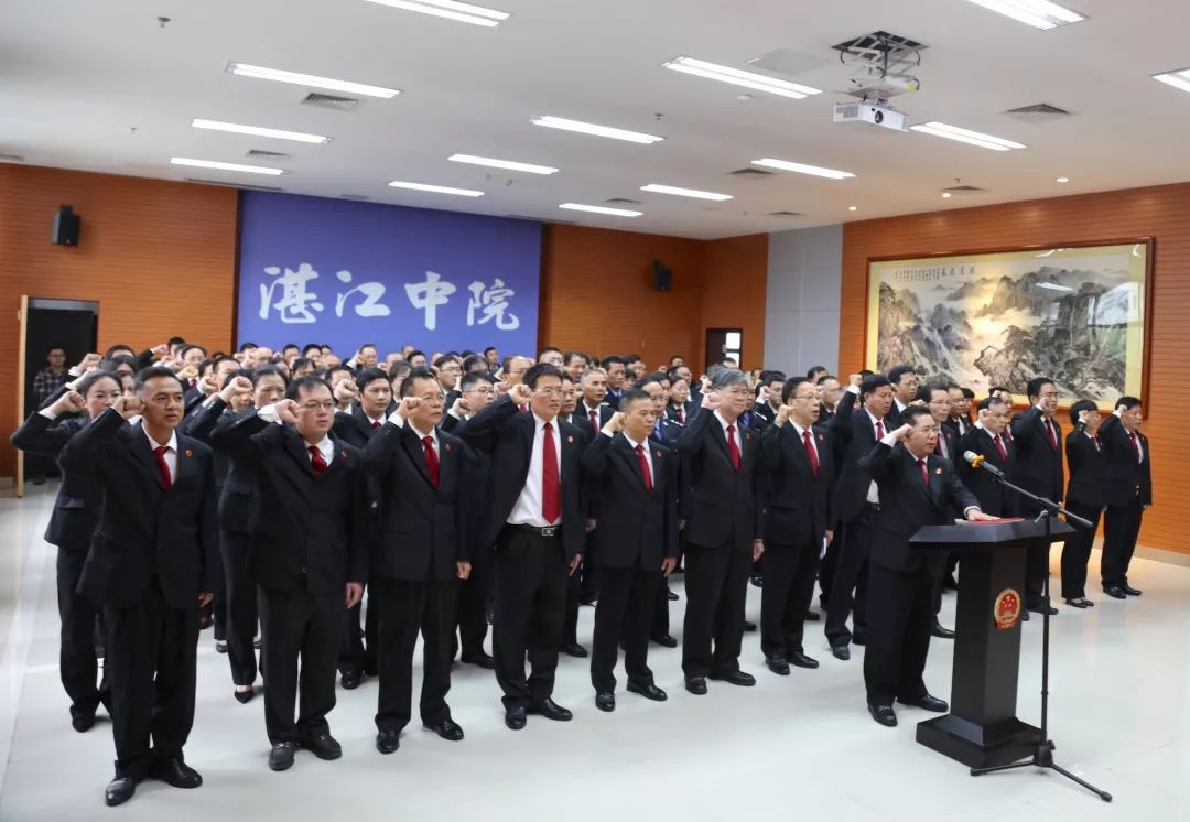 上午9时,湛江中院宪法宣誓活动正式开始。党组书记、院长廖万春手抚宪法,领诵誓词,全体干警跟诵誓词。