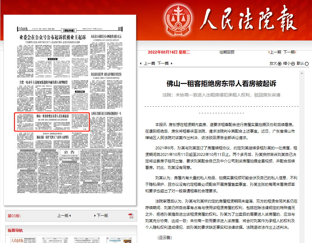 8月16日,《人民法院报》刊发禅城法院案例《佛山一租客拒绝房东带人看房被起诉——法院:未协商一致进入出租房侵犯承租人权利,驳回房东诉请》。