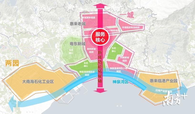 揭阳市委市政府立足当前发展实际,突出平台载体的支撑作用,坚持产城融合的发展方向,在五大功能区的规划基础上,建设惠来老城和粤东新城、大南海石化产业园、惠来临港产业园“一城两园”,布局“油、化、气、电、服”五大主导产业,形成“一城两园、产城联动、一轴一湾、强心带动”的空间结构,构筑广东沿海经济带新增长极的重要支撑。