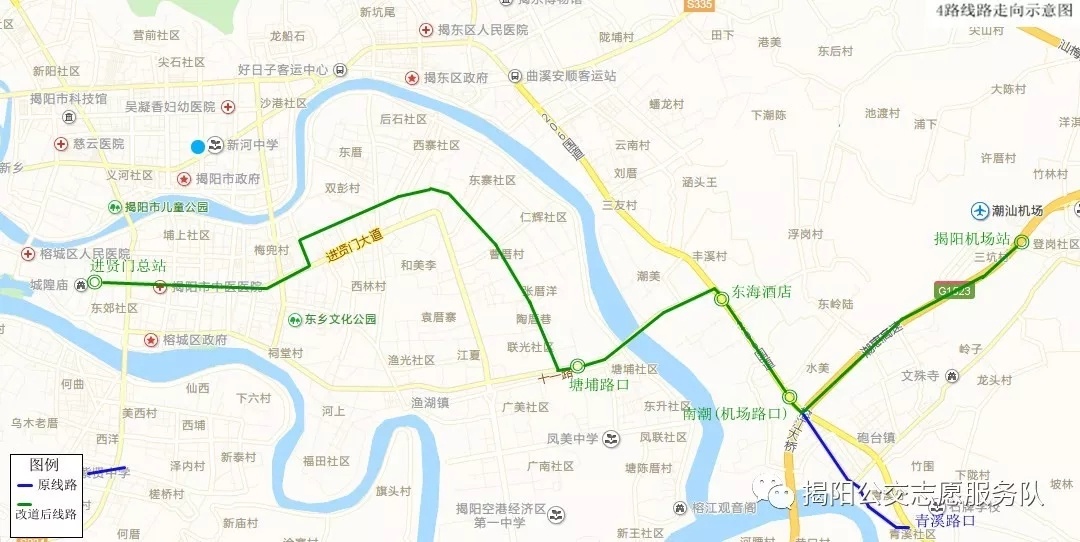 线路改道后自206国道进入机场路,新增龙祥花园、揭阳机场站站点,不再途经涵华路,取消砲台服装城、砲台车站、青溪路口站点,需要搭乘4路的乘客可换乘9路、10路、12路到揭阳技校或东海酒店站换乘。
