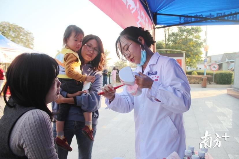陈浩玲是来自中山大学附属口腔医院的志愿者,也是一名执业医师。原籍揭阳榕城区的她在广州学习、工作、定居,这是她第一次参加“七个一百”精品项目下基层活动。“当时在医院得知有名额可以参与下基层活动,而且地点是我的家乡揭阳,想到可以用自己所学为父老乡亲服务,我马上就报名了。”陈浩玲表示,本次惠民义诊主要是为村民检查龋齿、牙周炎等口腔情况,普及护牙知识,教授正确刷牙方法。与陈浩玲同行的还有另外两位外地同事。潭王村的村民普通话水平不高,陈浩玲的母亲也作为志愿者,充当“翻译”,为医生与村民搭建起沟通的桥梁。