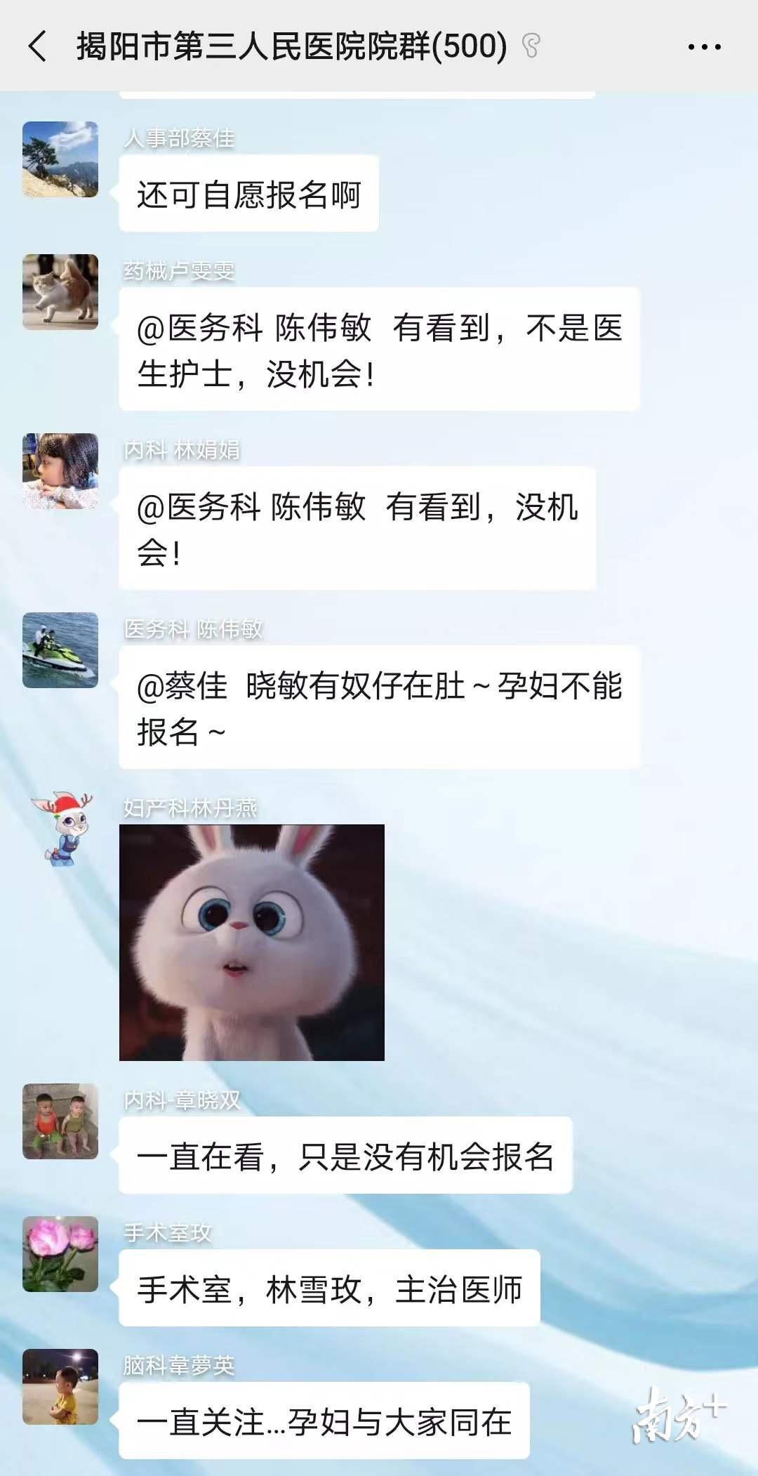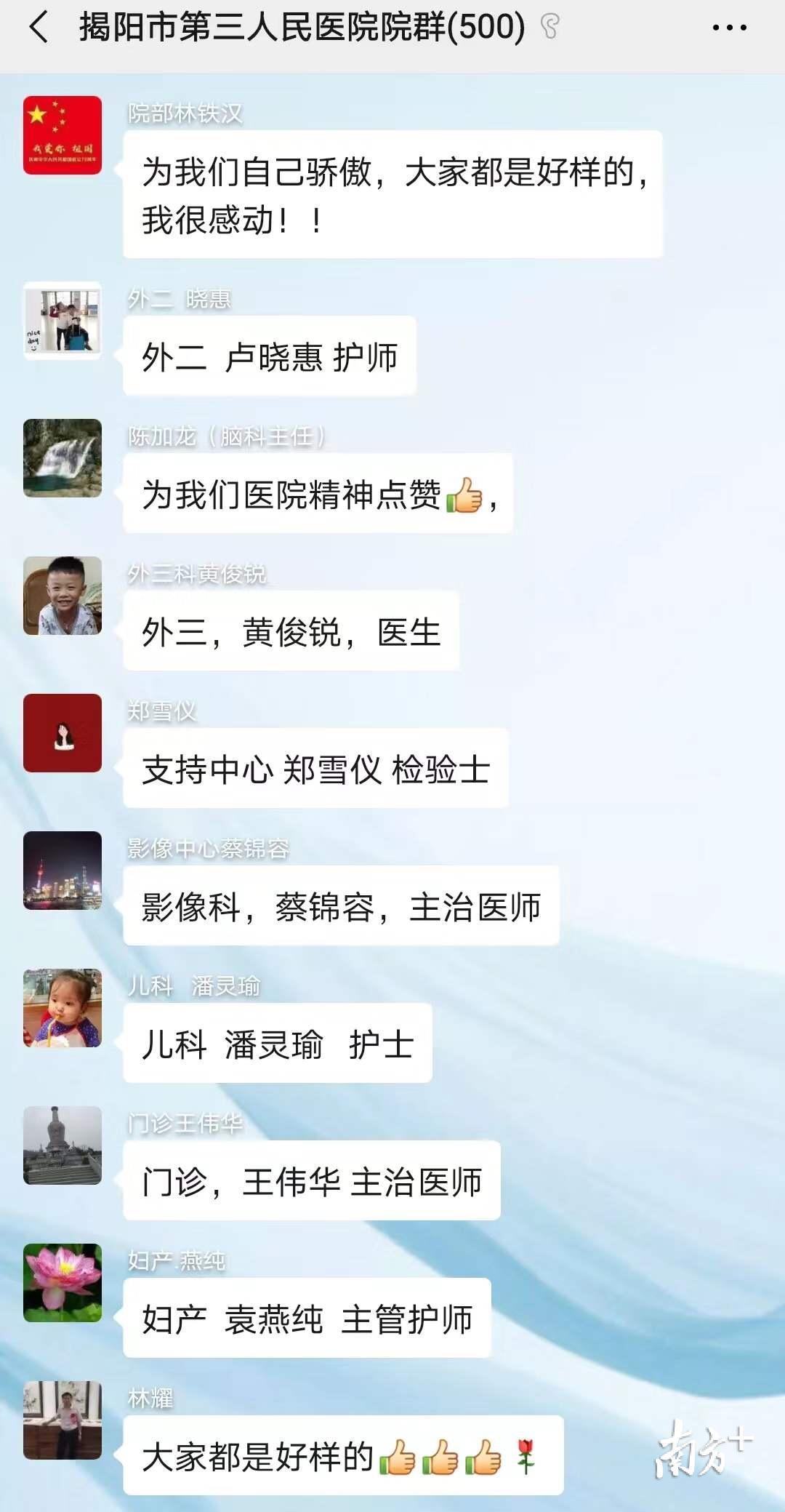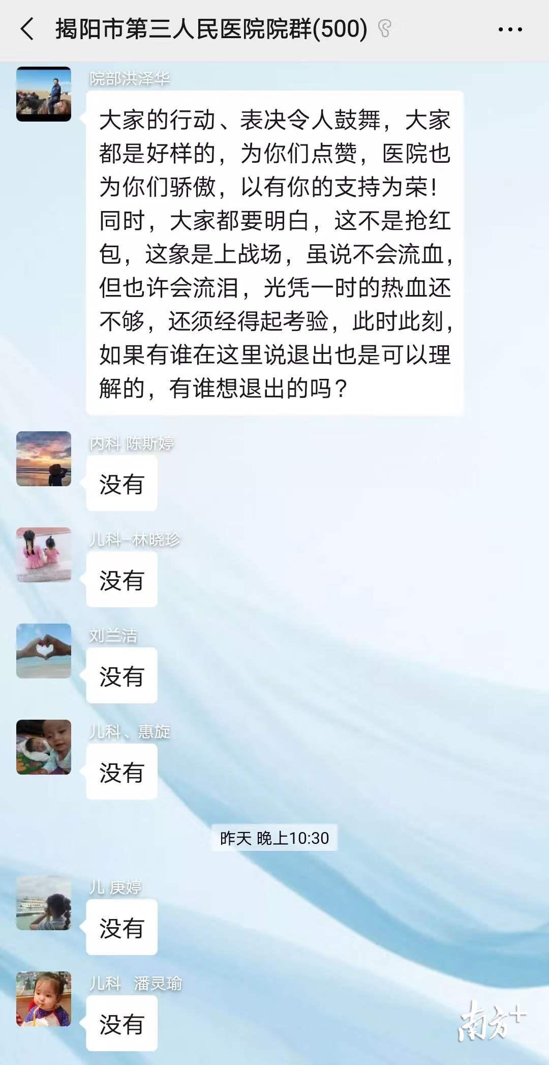 医院副院长洪泽华在工作群中动情地说:“大家都是好样的,为你们点赞,医院也为你们骄傲,以有你的支持为荣!同时,大家都要明白,这不是抢红包,这像是上战场,虽说不会流血,但也许会流泪,光凭一时的热血还不够,还须经得起考验,此时此刻,如果有谁在这里说退出也是可以理解的,有谁想退出的吗?”