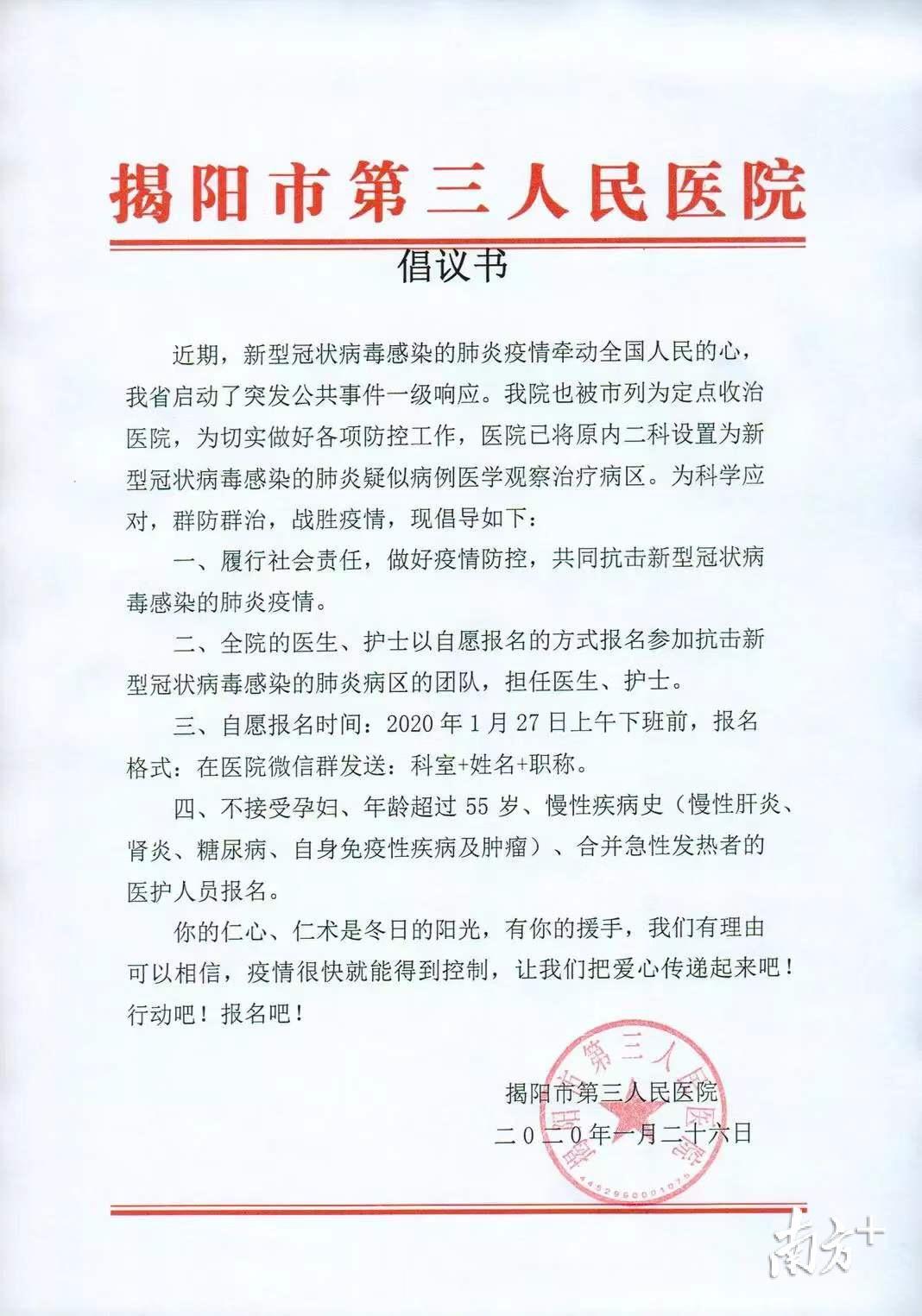 1月26日是正月初二,揭阳市通报25日确诊3例新型冠状病毒感染的肺炎病例情况,这也是揭阳首次报告确诊病例。当晚,一份倡议书在揭阳市第三人民医院的微信工作群中迅速传开。作为揭阳市新型冠状病毒感染的肺炎定点收治医院之一,第三人民医院将原内二科设置为疑似病例医学观察治疗病区,并倡导全院医生、护士以自愿方式报名参加病区团队。