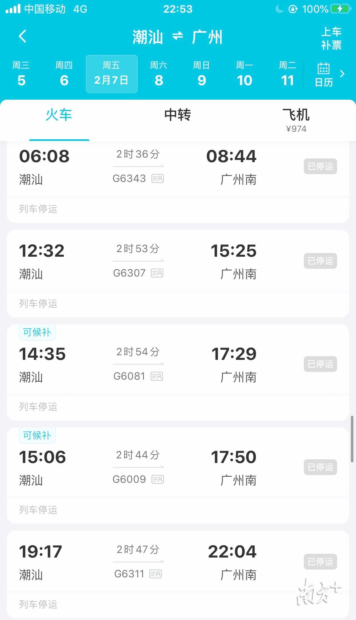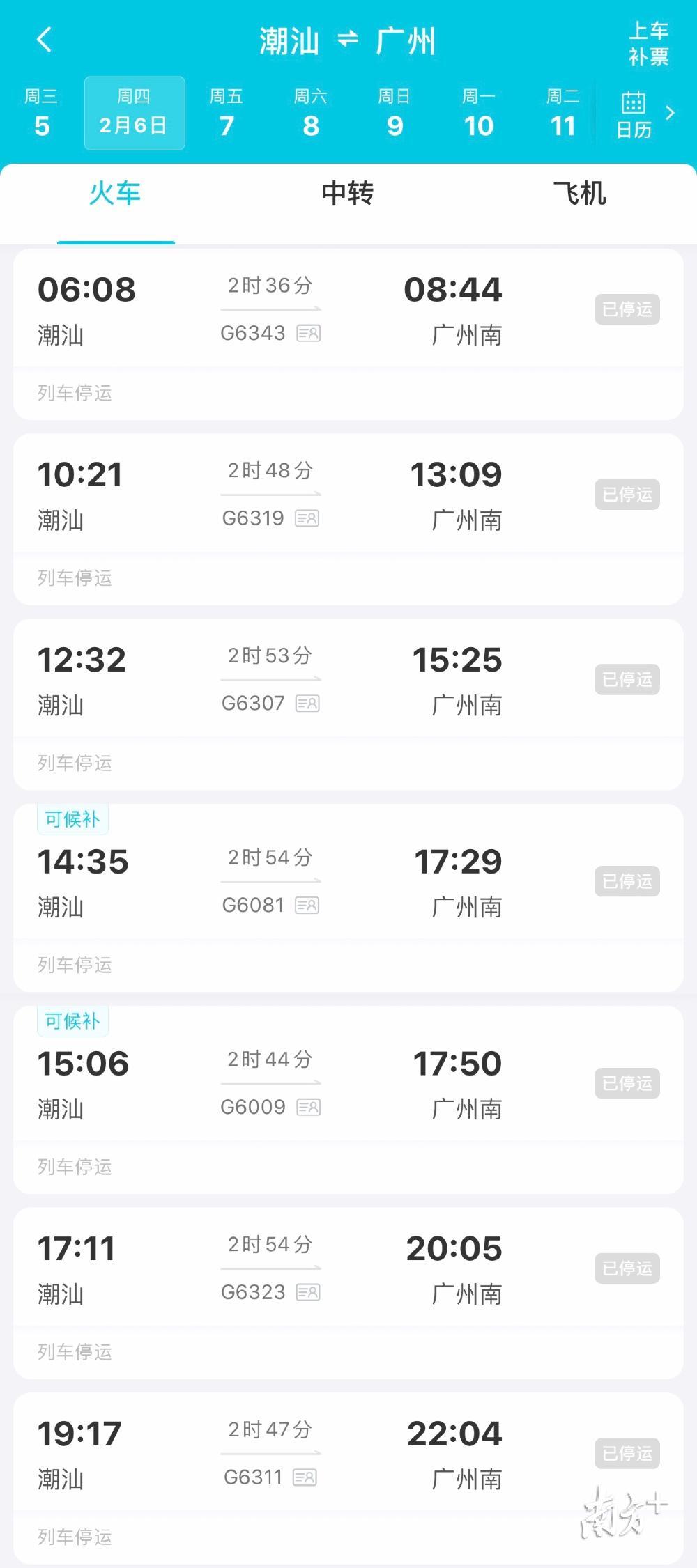6日从潮汕至广州南的G6343、G6319、G6307、G6081、G6009、G6323、G6311次列车停运。