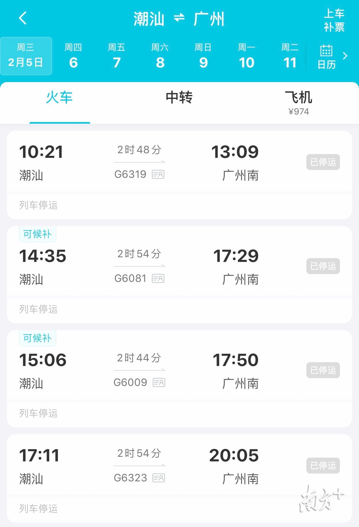 5日从潮汕至广州南的G6319、G6081、G6009、G6323次列车停运。