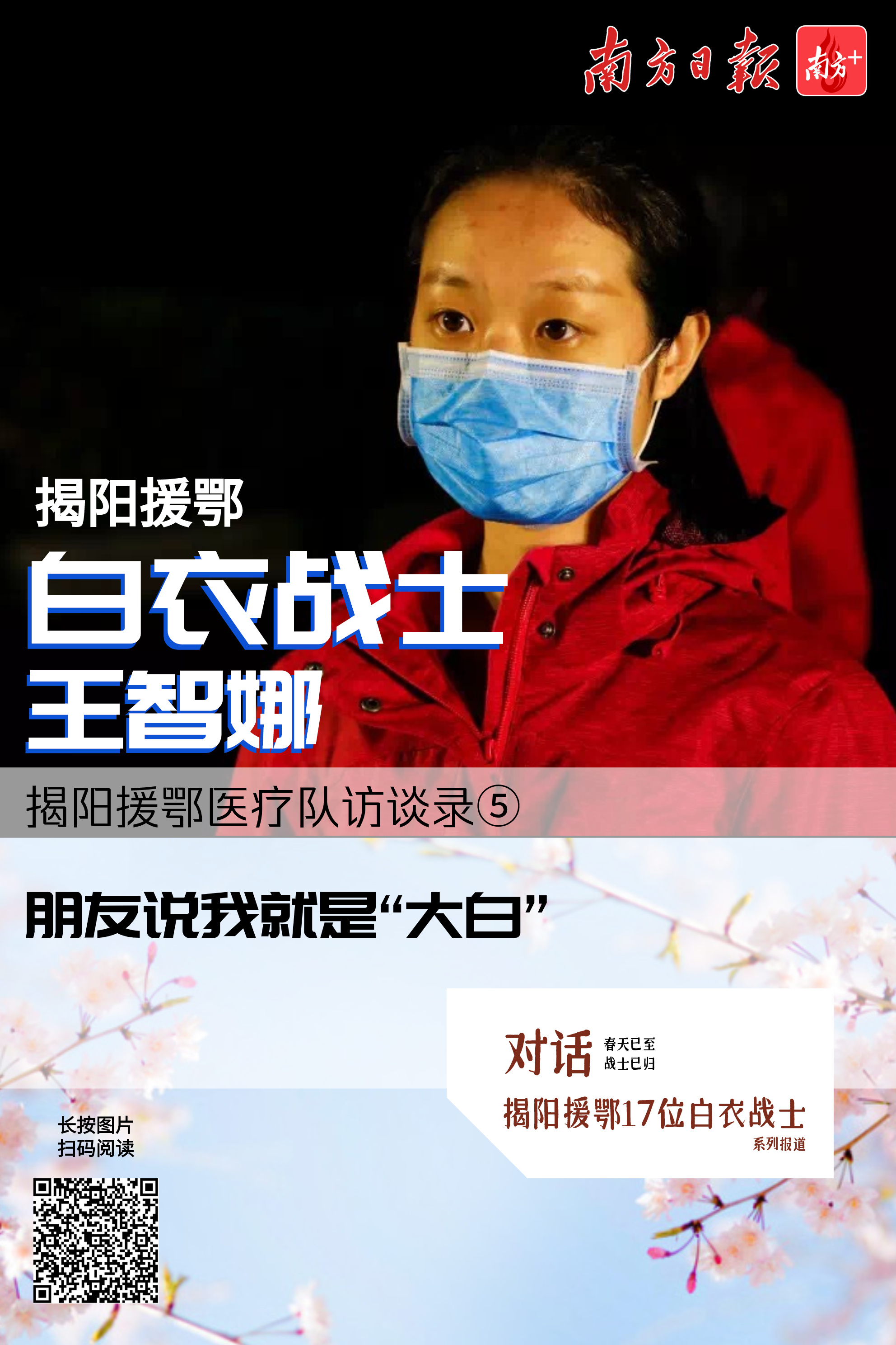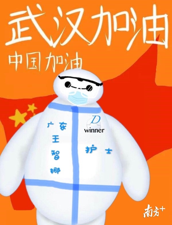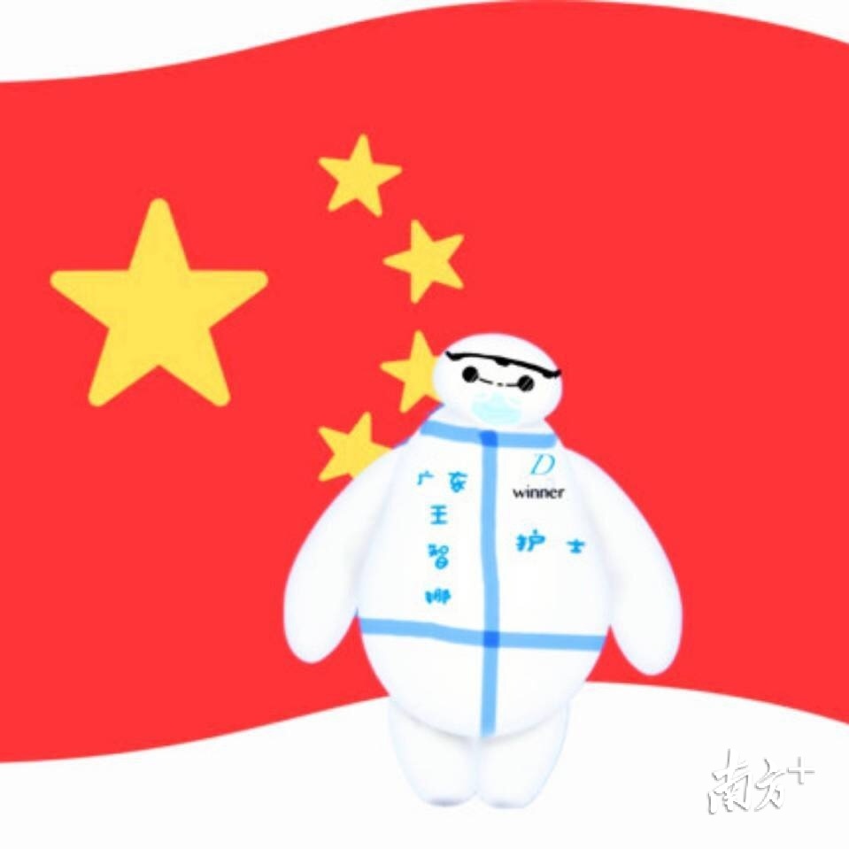 在鲜艳的五星红旗前,“大白”戴着口罩,身上写着“D(区)护士”“广东王智娜”——这个极有创意的画像就是王智娜的微信头像。