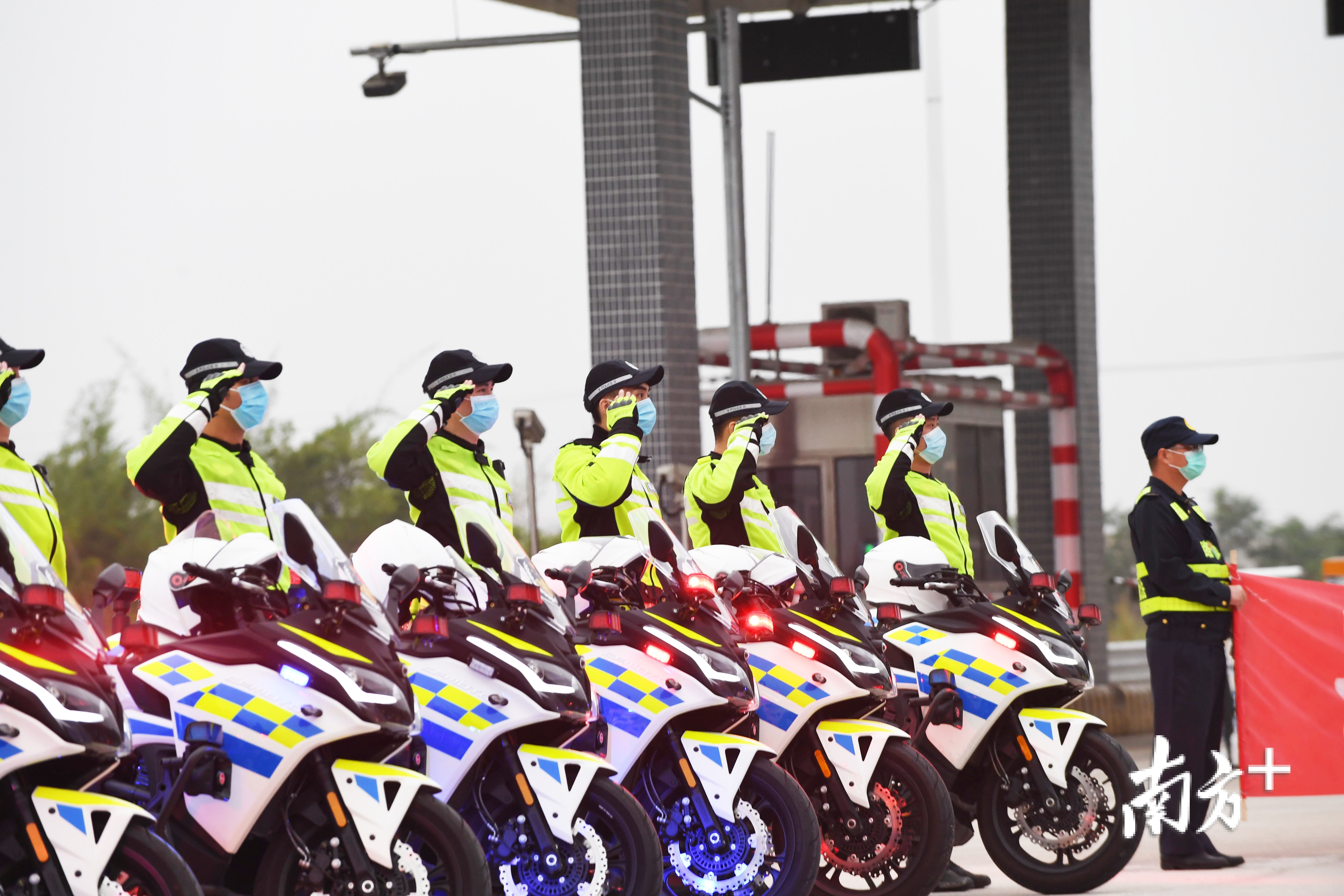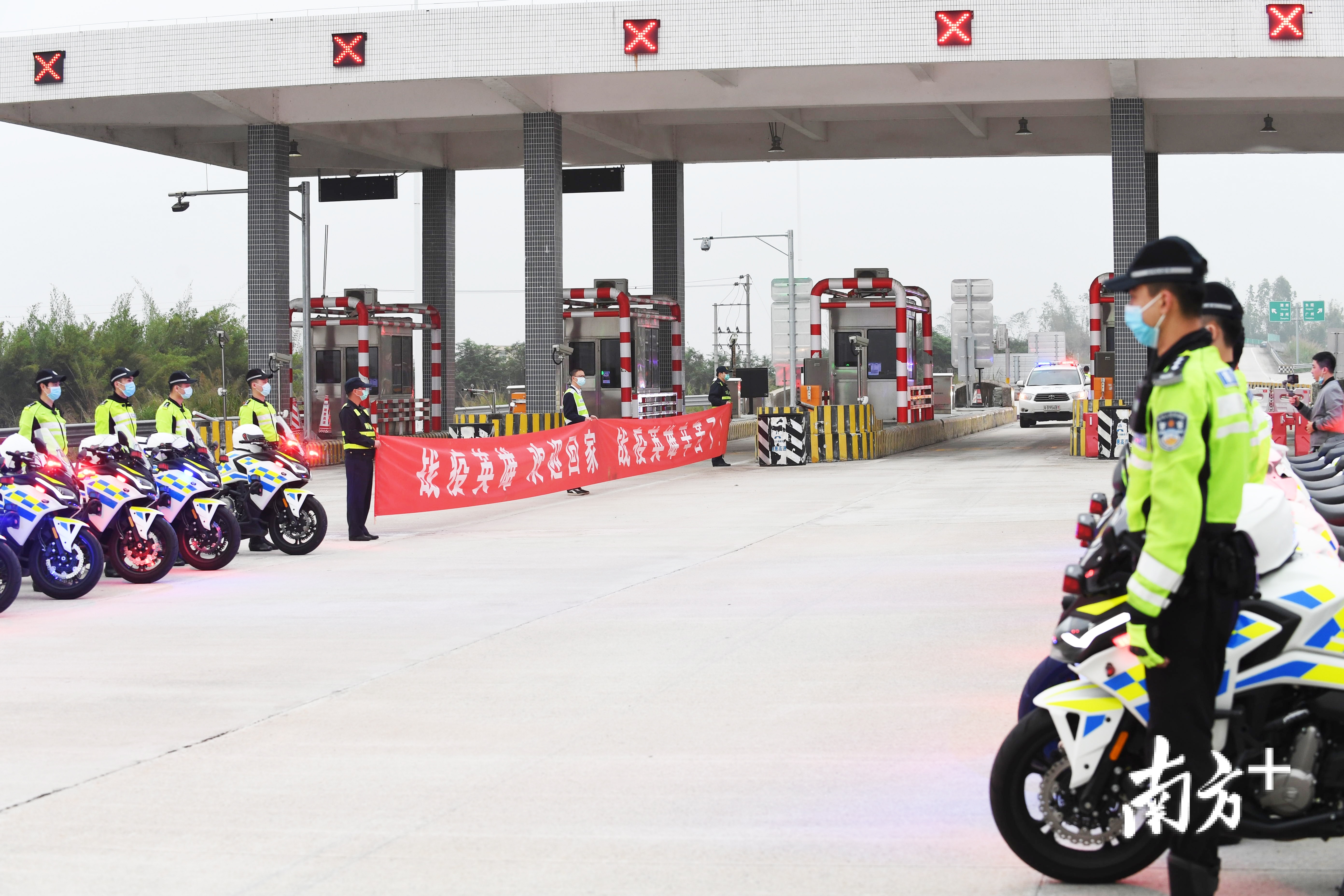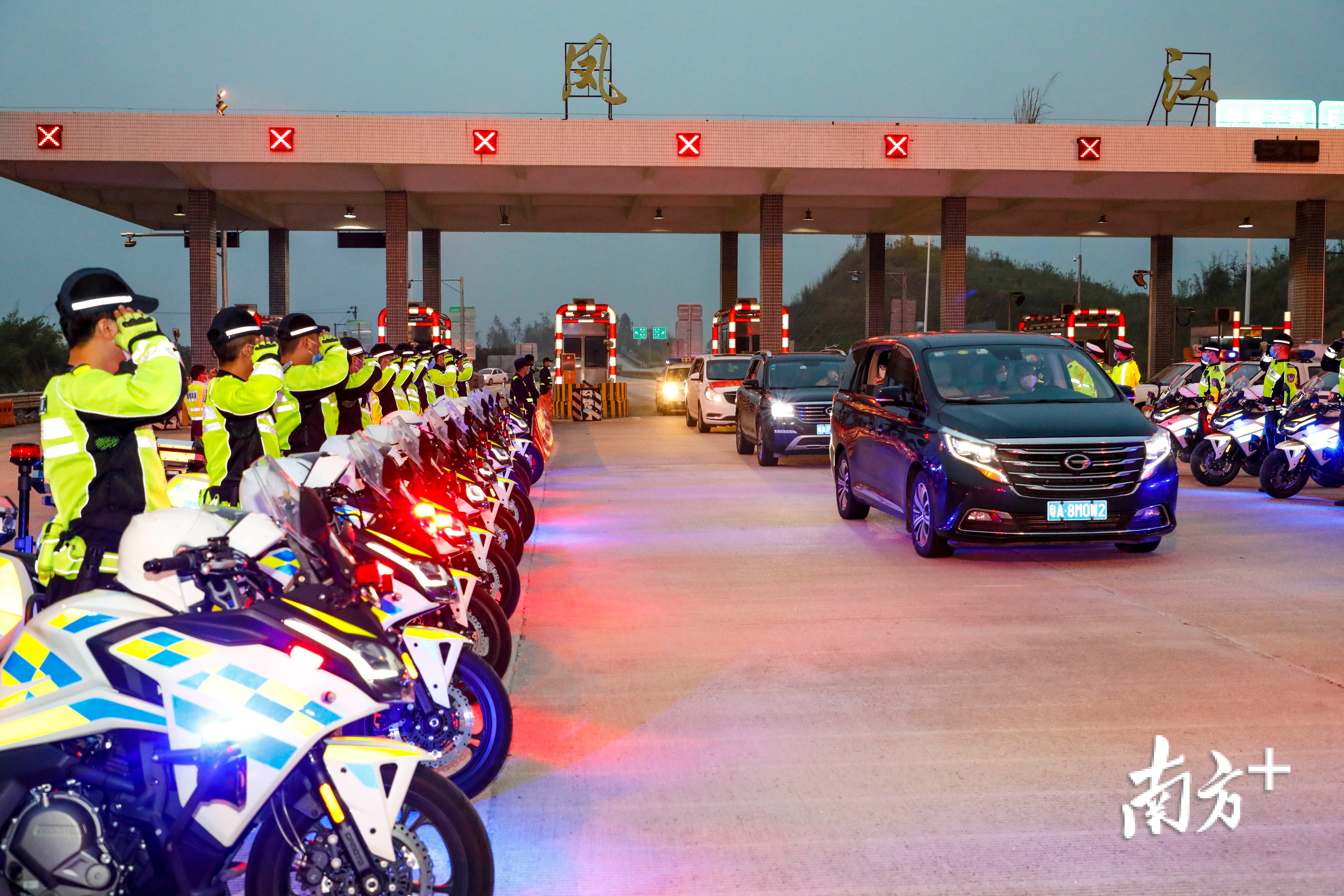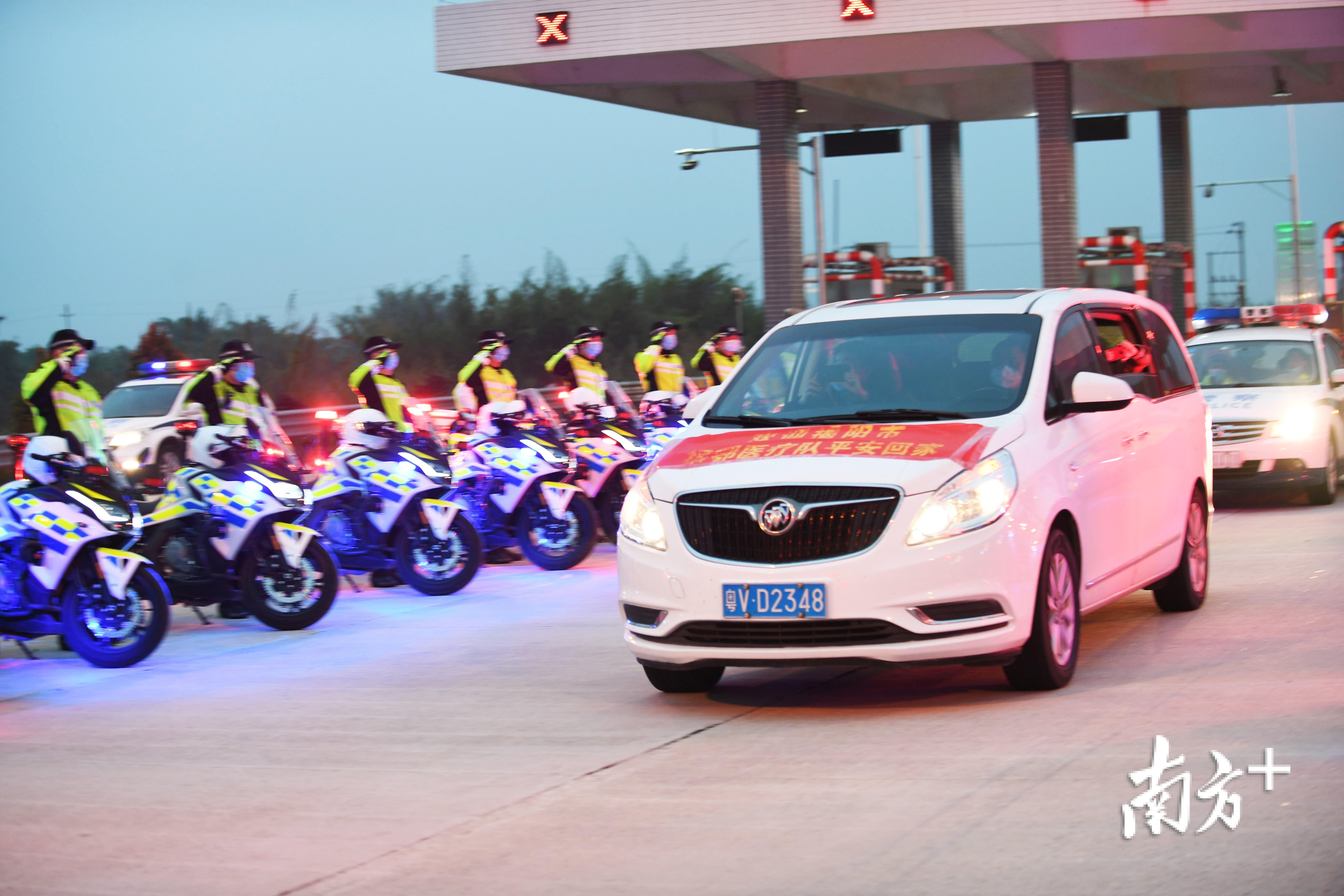 警笛欢鸣,警灯闪烁,以最高礼遇欢迎医疗队回家,向医疗队致敬。在交警车队的护送下,揭阳医疗队一行驶往集中休整地。