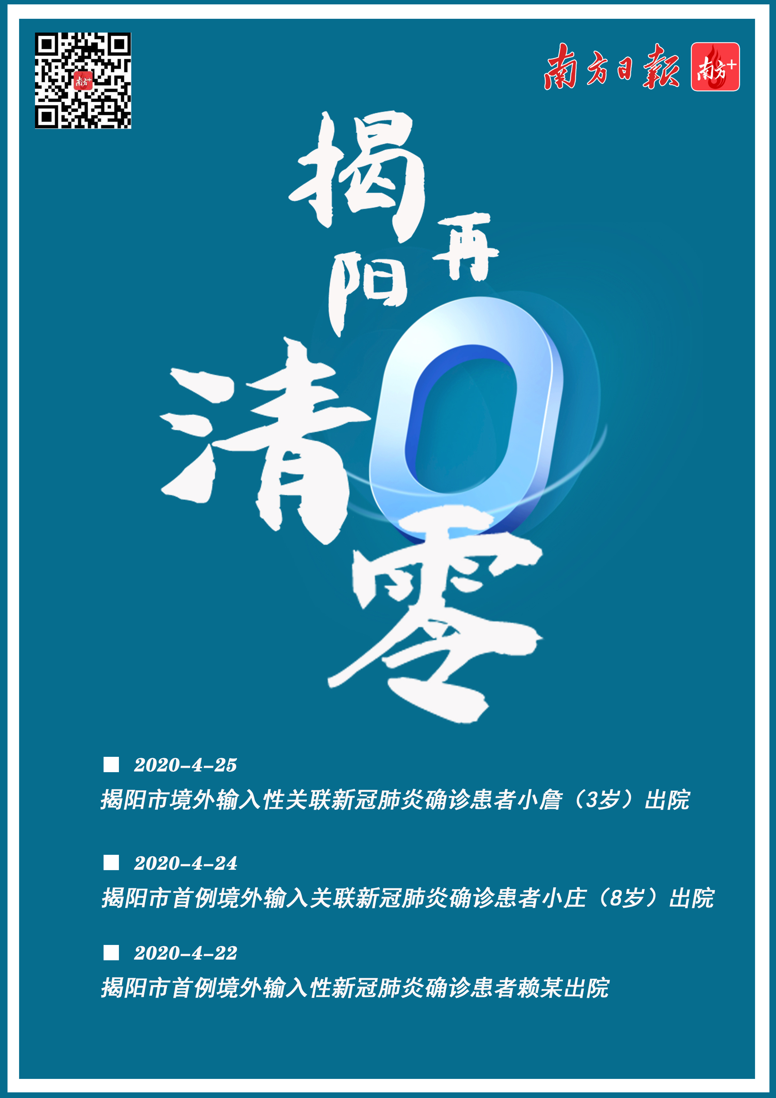 今天出院的患者小詹年仅3岁,男,现居住在惠来县溪西镇西尉村。自3月31日后,小詹每天均与4月22日出院的小庄共同生活。4月3日,小詹在惠来县集中隔离场所隔离观察,4日在揭阳市人民医院隔离治疗,揭阳市疾控中心核酸检测阳性,小詹是揭阳市第二例境外输入关联新冠肺炎确诊病例,也是所有患者中最年幼的。