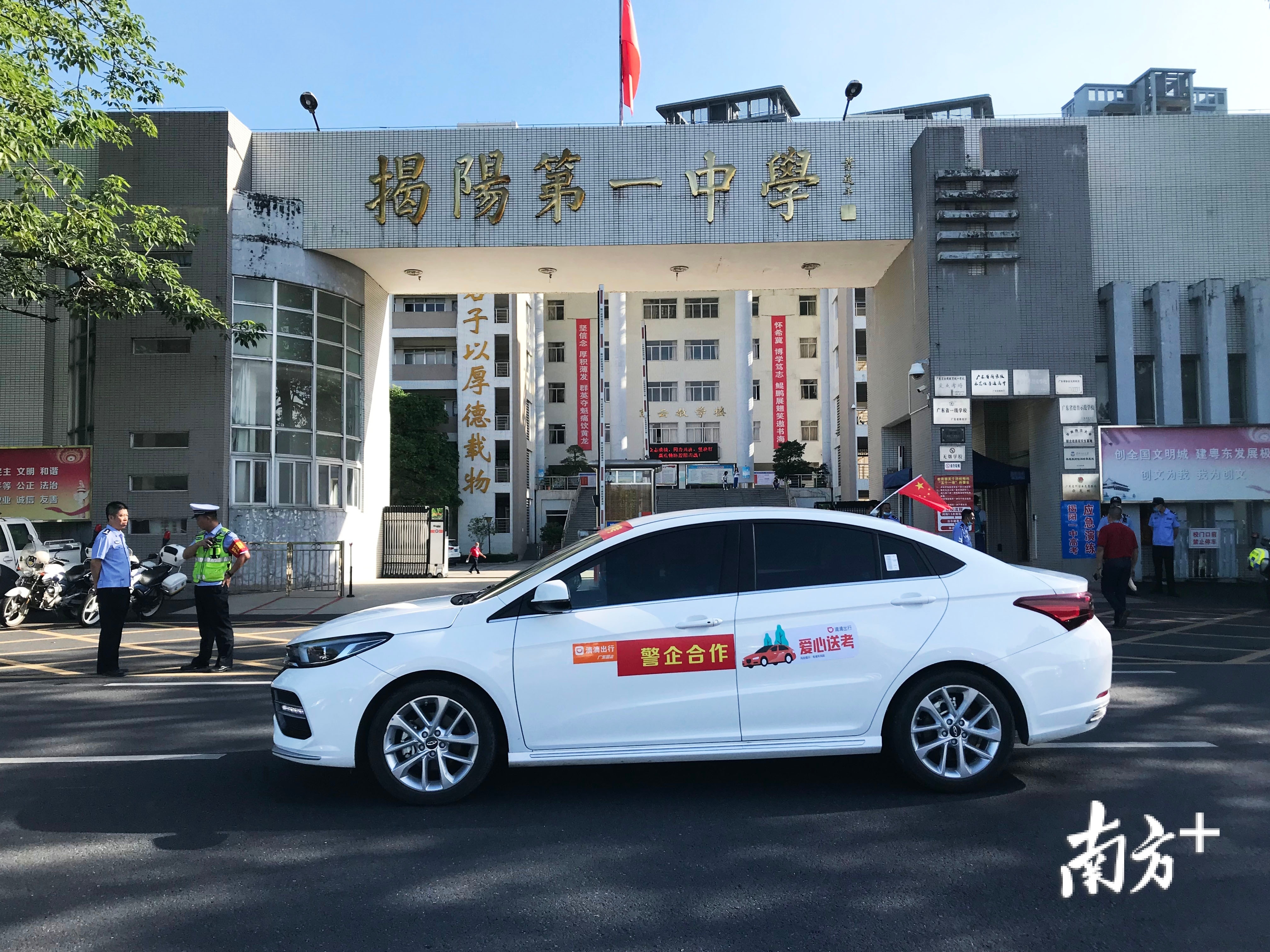 滴滴爱心司机在揭阳华侨中学外待命。
