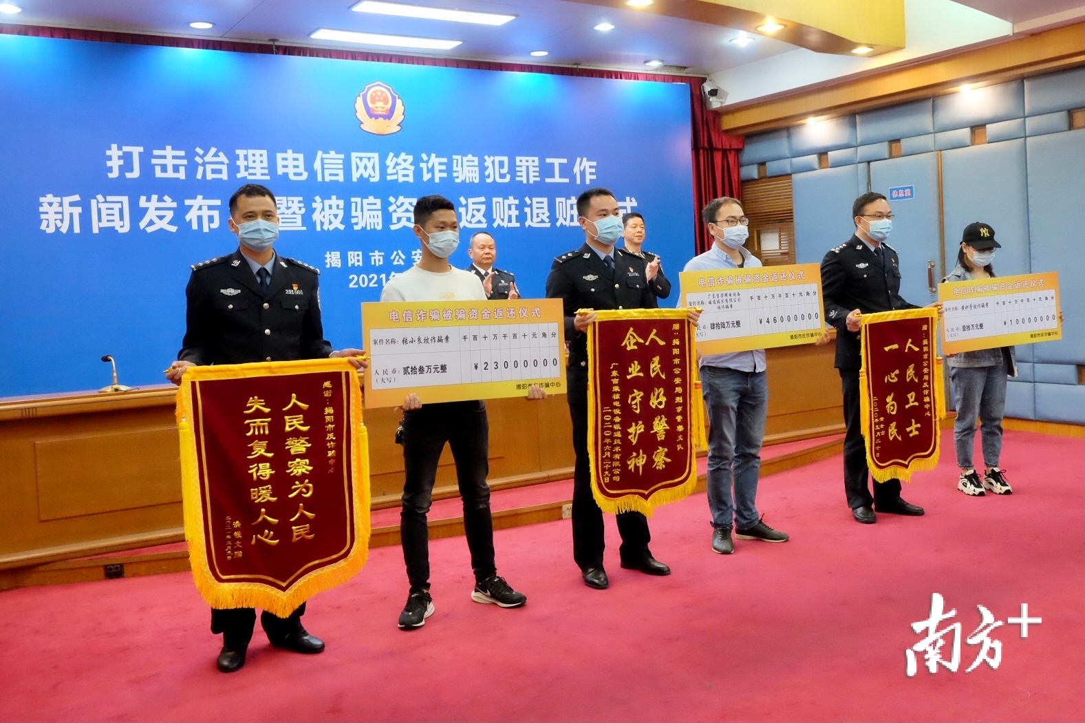 “感谢揭阳公安机关帮助我们挽回经济损失!”3月19日上午,揭阳市公安局召开揭阳市打击治理电信网络诈骗犯罪工作新闻发布会暨被骗资金返赃退赃仪式。揭阳市“打电诈”联席召集人、揭阳市公安局党委委员、副局长陈卢荣通报了该市电信网络诈骗的形势以及公安机关“打电诈”主要工作措施和成效;本次发布会被骗资金返赃退赃仪式上,揭阳市公安局还向部分受骗群众返还被骗资金,总额共计193.4964万元。
