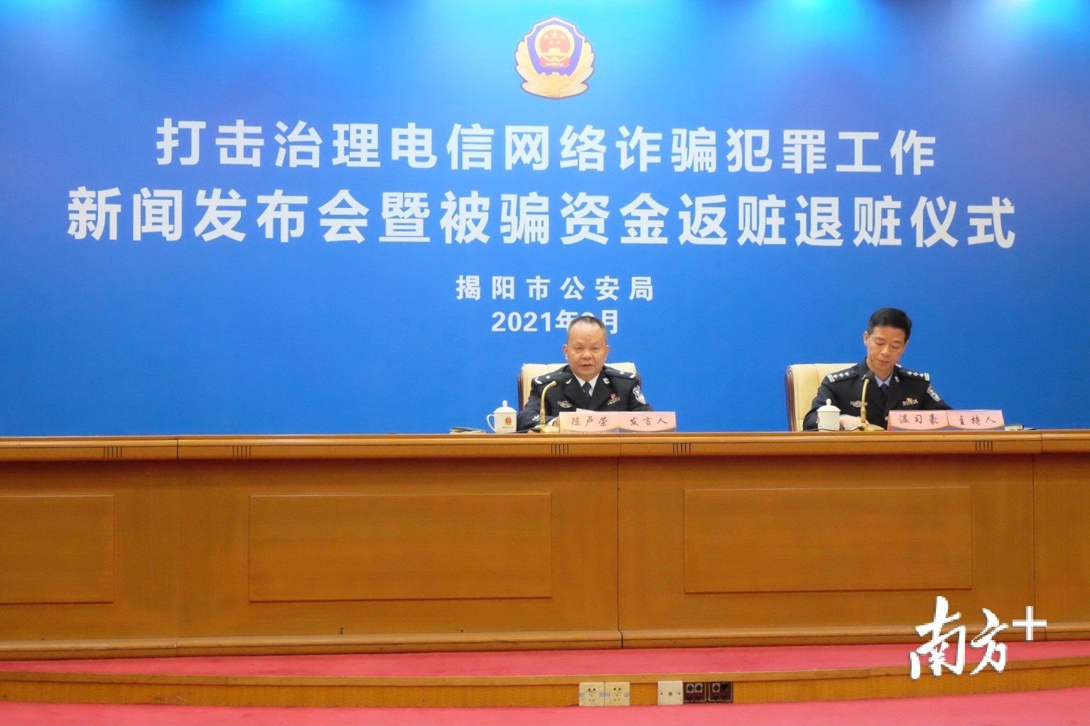 揭阳市打击治理电信网络诈骗犯罪工作新闻发布会暨被骗资金返赃退赃仪式现场。