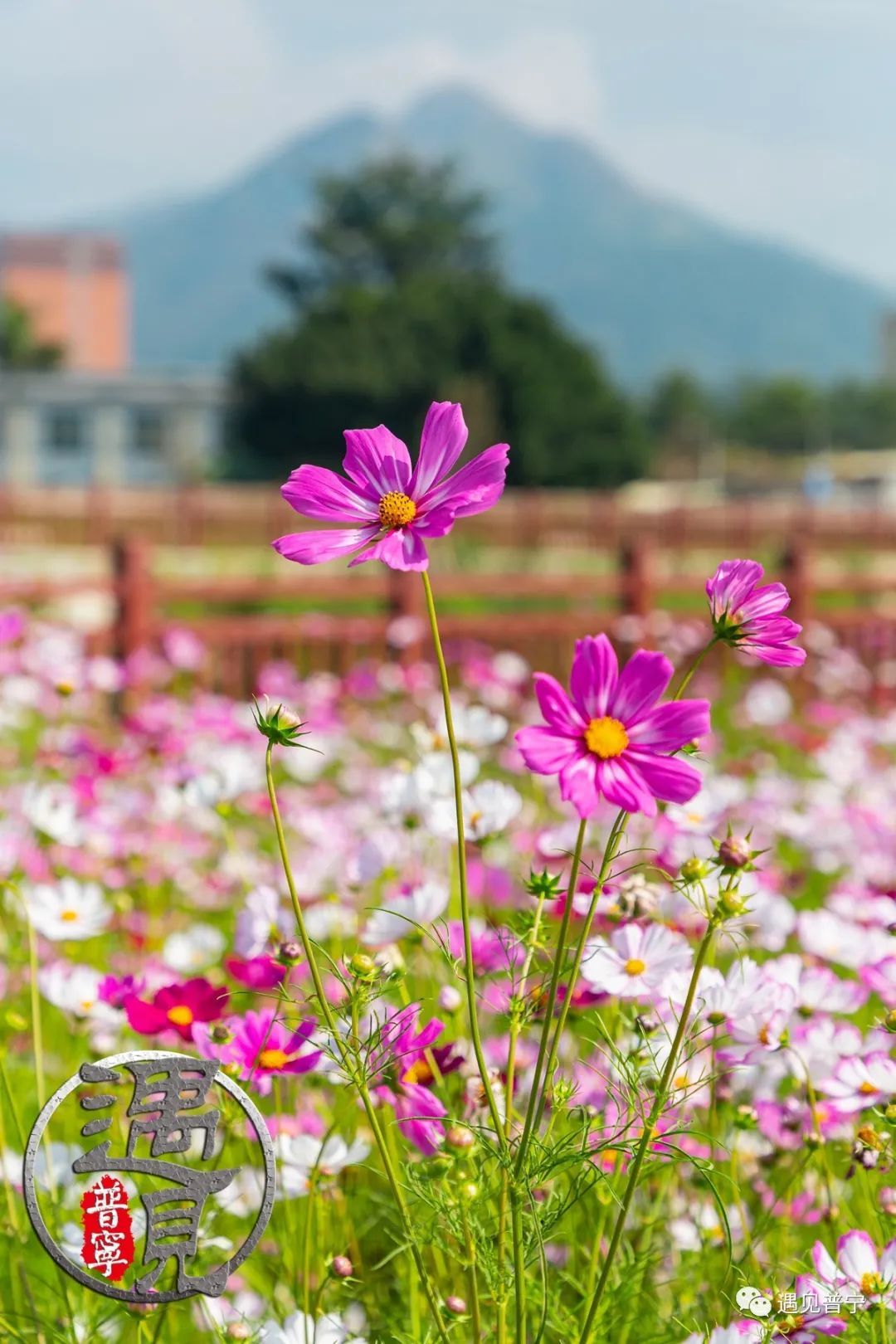 还记得去年渔新村那片美丽的格桑花海吗?时间过得真快,转眼已入冬,渔新村花海又盛放了。恰逢今天阳光明媚,蓝天白云,格桑花发出淡淡的微光,晶莹剔透,美似仙女,一朵比一朵长得艳丽。引来许多蝴蝶和蜜蜂翩翩起舞,与周围的祠堂和溪流相得益彰,美丽极了。