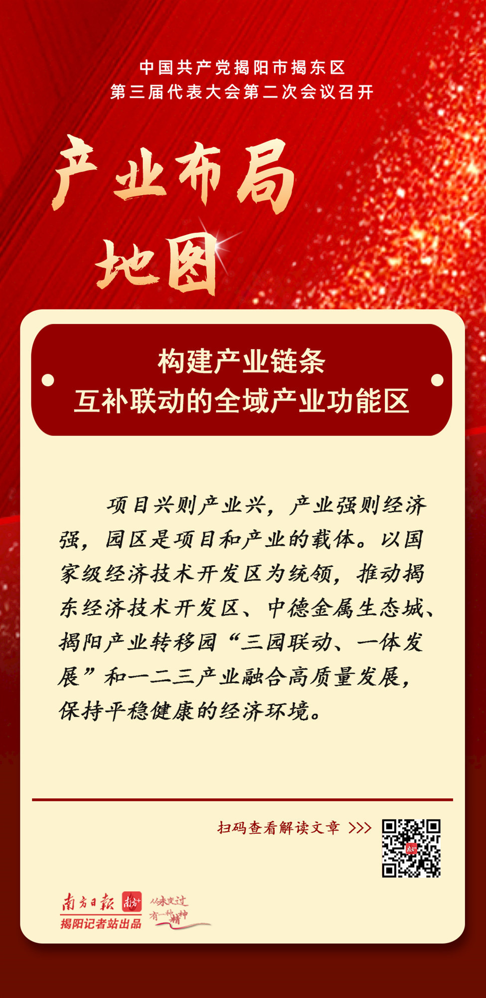 作为全市产业“排头兵”的揭东,去年在区第三次党代会上提出要“打造环境可载的现代产业区”;步入2022年,在2月23日的区三届二次党代会上,揭东进一步提出要谋划落实好“产业布局地图”——“构建产业链条互补联动的全域产业功能区”:以国家级经济技术开发区为统领,推动揭东经济技术开发区、中德金属生态城、揭阳产业转移园“三园联动、一体发展”和一二三产业融合高质量发展,为揭阳打造“沿海经济带上的产业强市”贡献揭东力量。