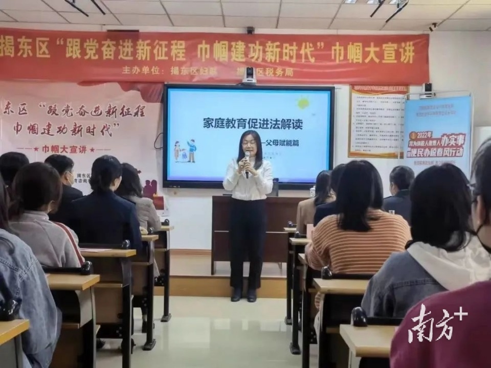 家庭是人生的第一个课堂,父母是孩子的第一任老师。今年3月以来,揭阳市揭东区妇联在全区范围内开展了100场家庭教育进村(社)实践活动,推动家庭教育促进法宣传实施,形成爱国爱家、相亲相爱、向上向善、共建共享的社会主义家庭文明新风尚。