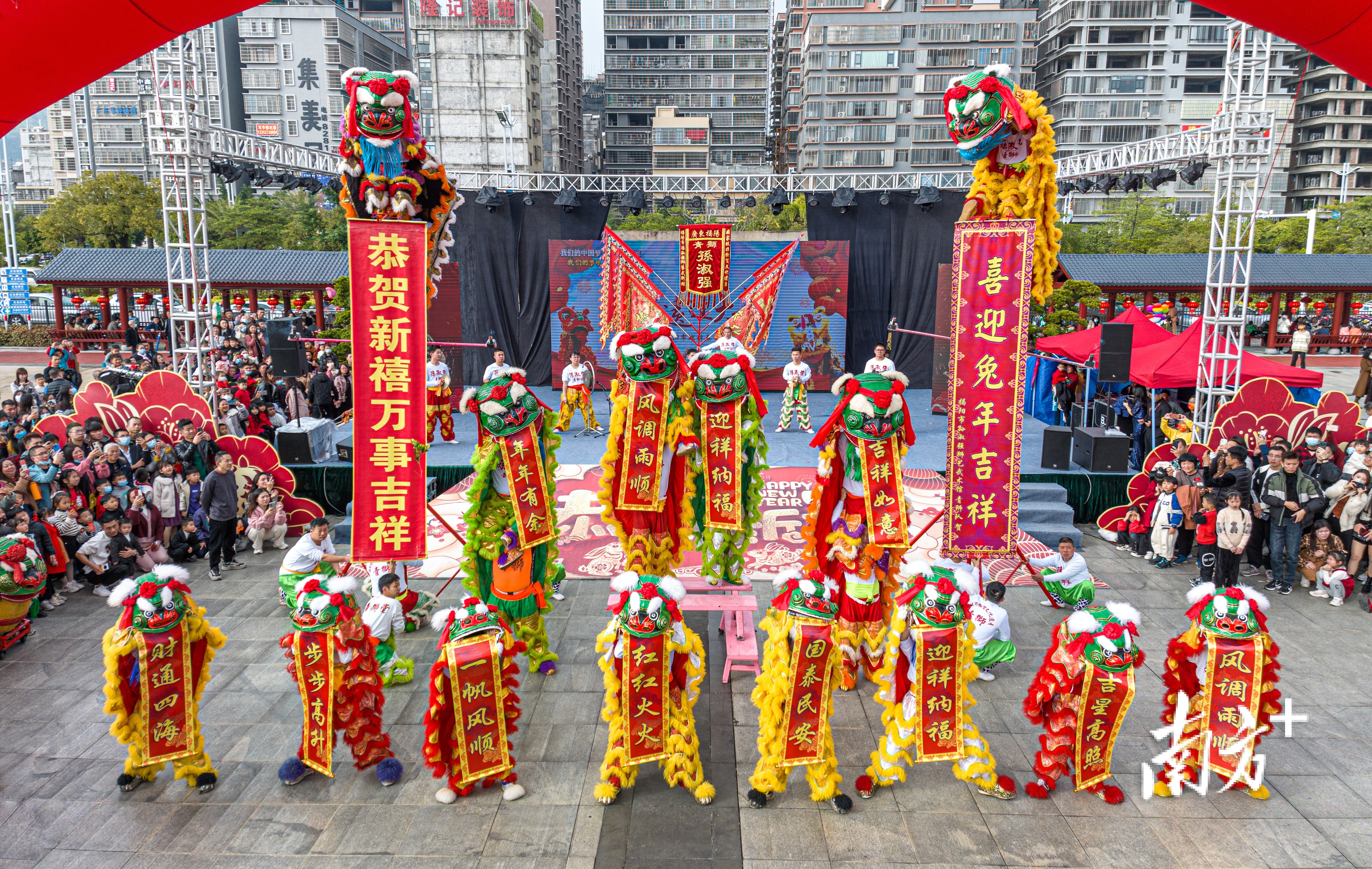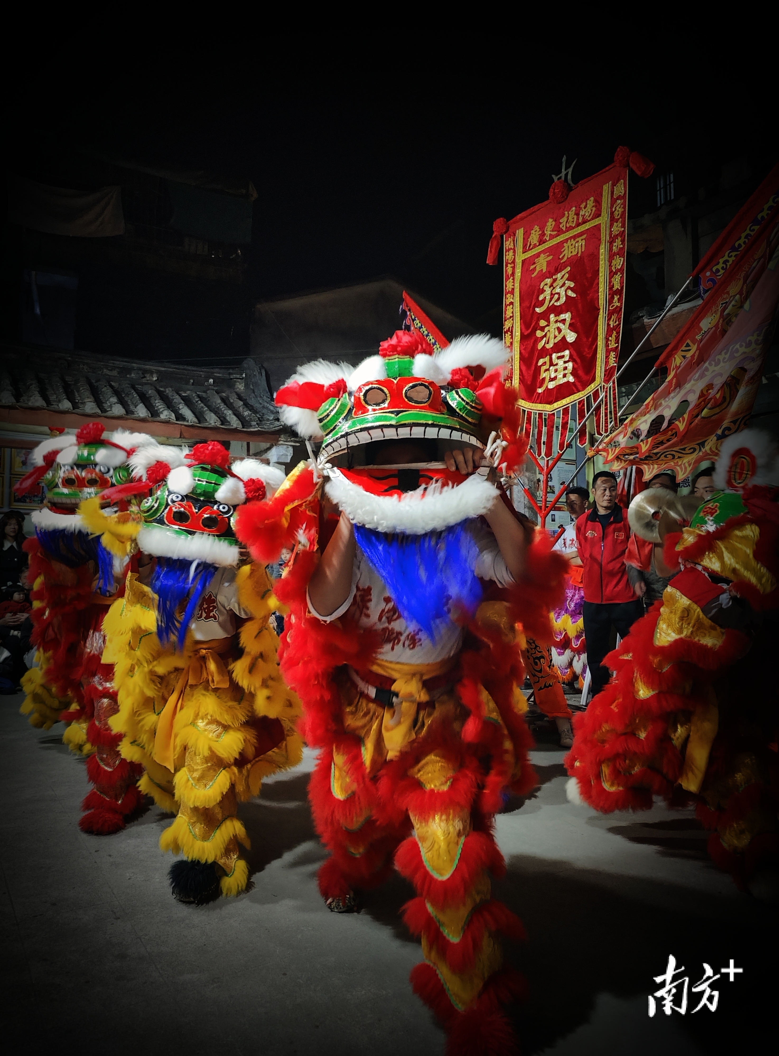 “青狮”是潮汕地区独特的传统狮舞,揭阳市孙淑强狮艺武术馆传承的榕城青狮是国家级非遗。青狮表演的主要动作是“打狮节”,有狮翻身、狮过桥、踏七星、踩八卦等十八节套路。大年初一起,榕城青狮在揭阳古城进贤门、青狮文化旅游景区等地进行表演。