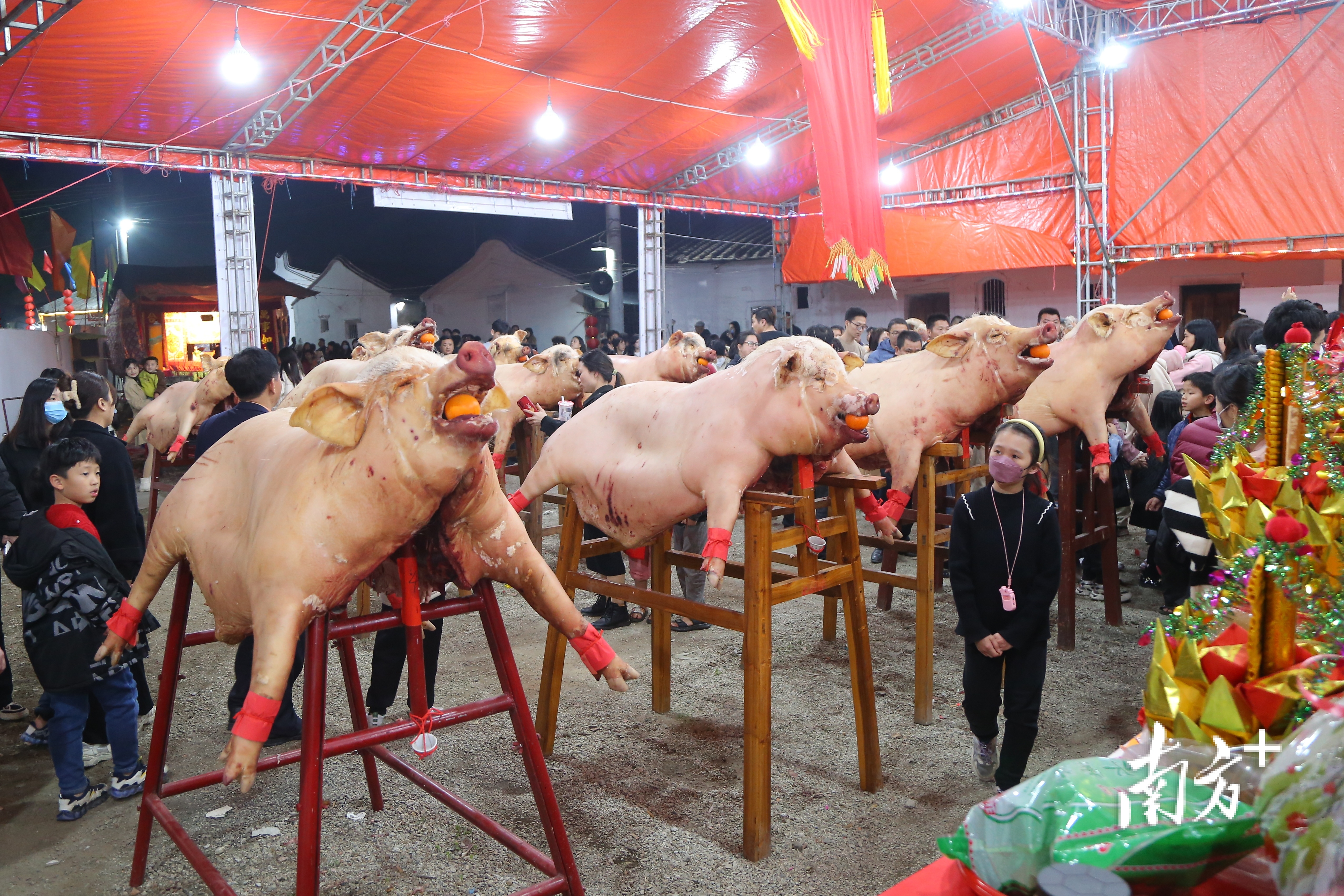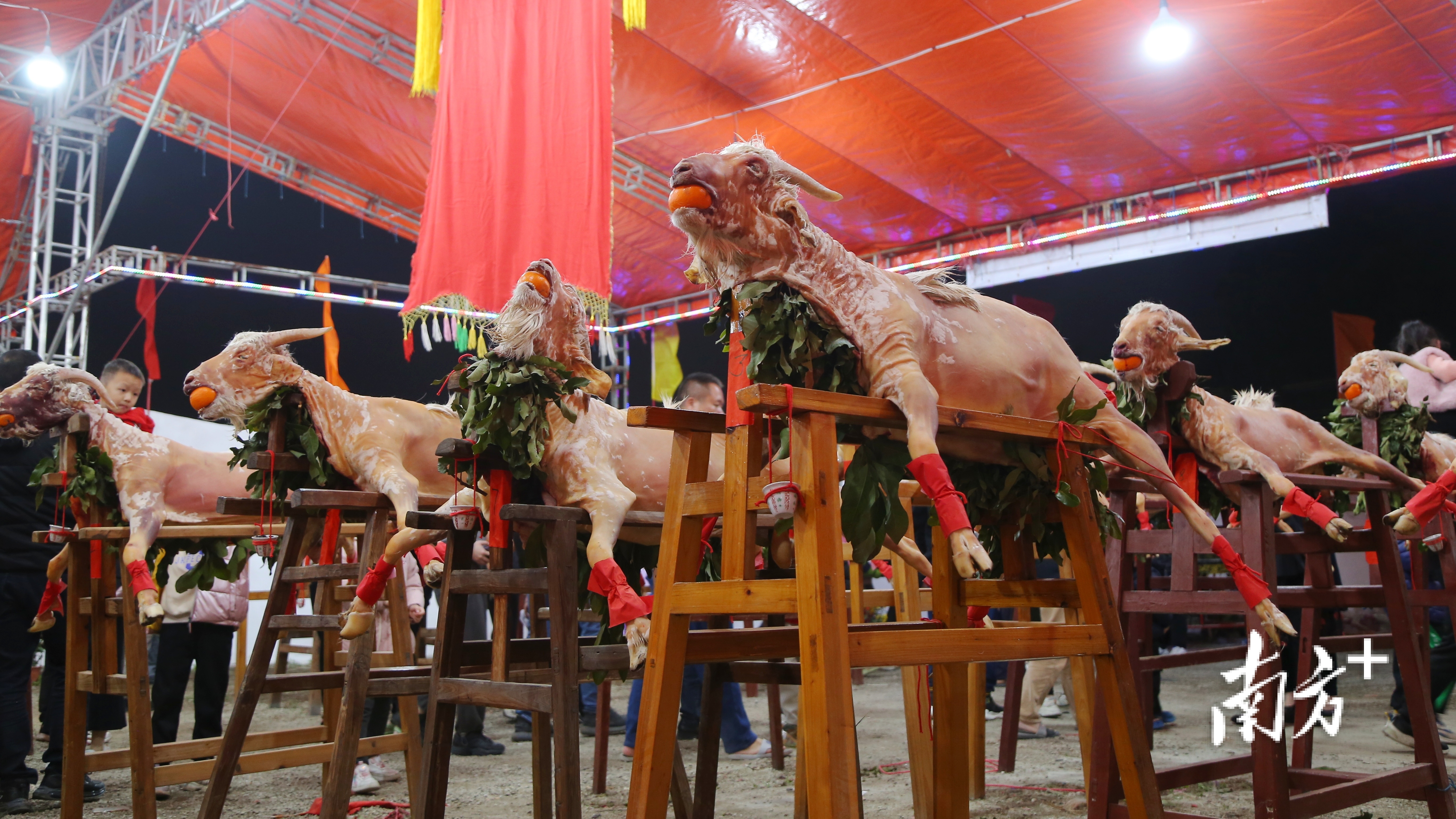 到元宵节,村民们宰杀大公猪、大公羊,摆在木架上,猪口、羊口塞上桔子,寓意吉祥,祈盼五谷丰登,六畜兴旺,生活富足。