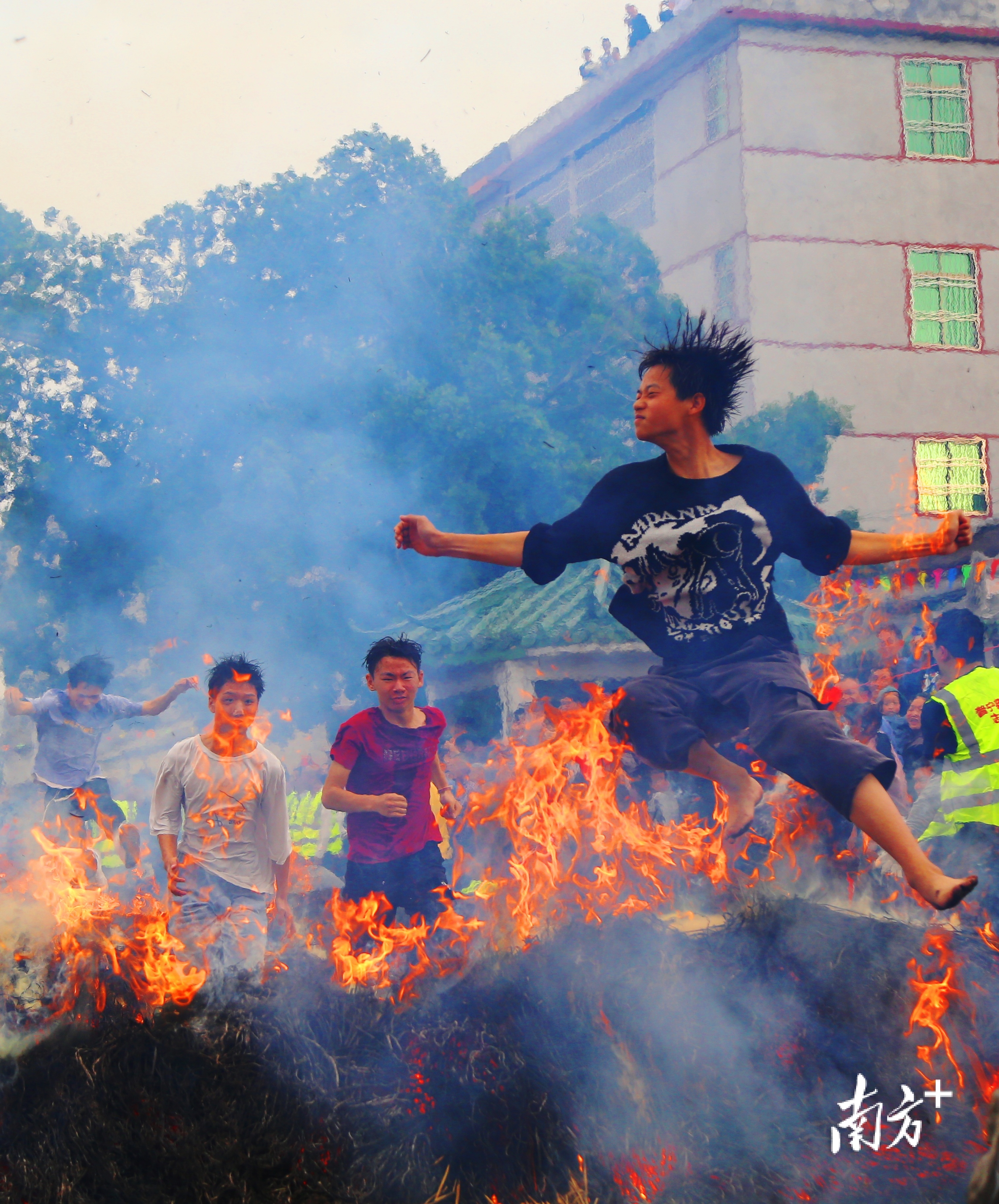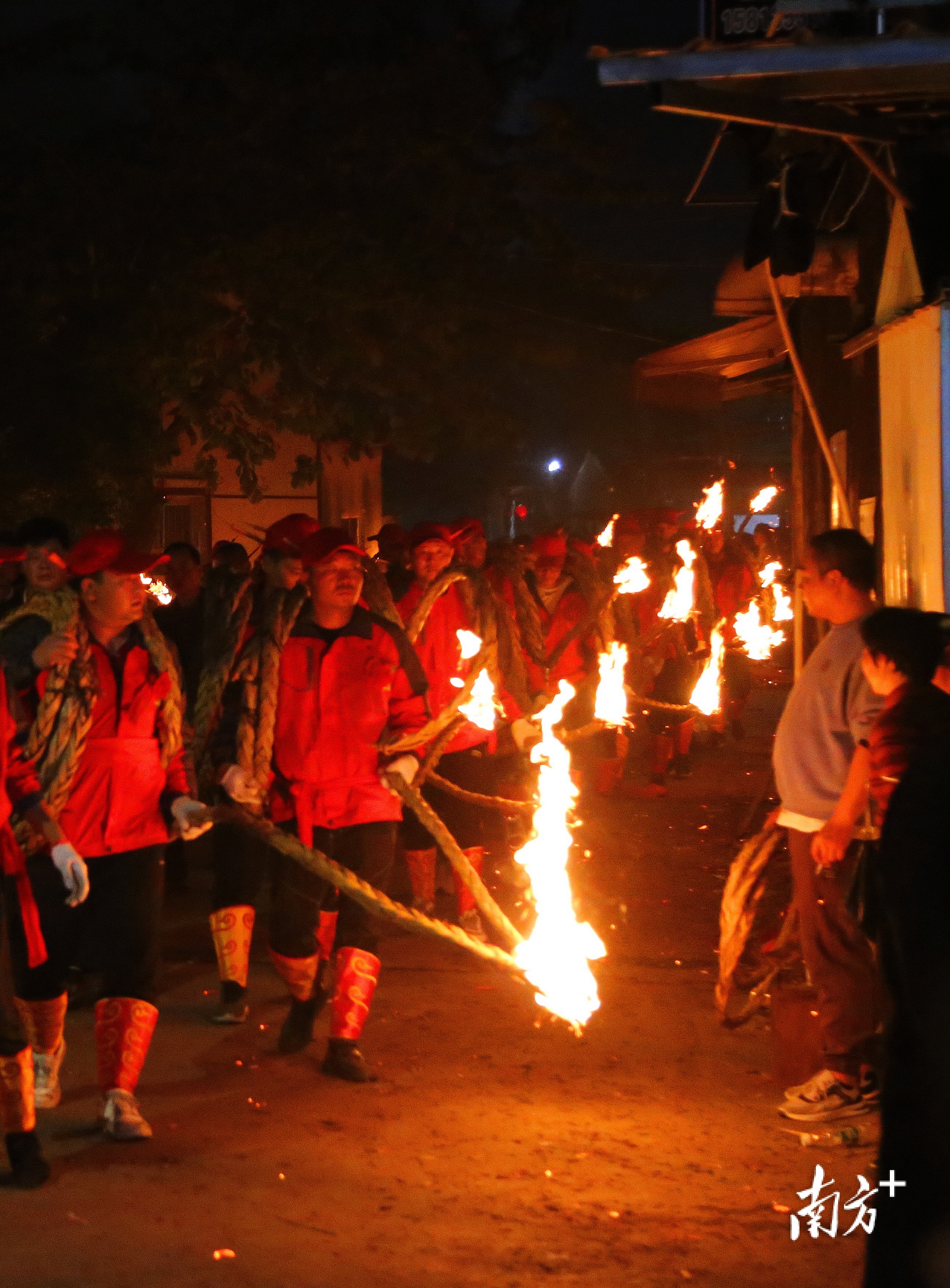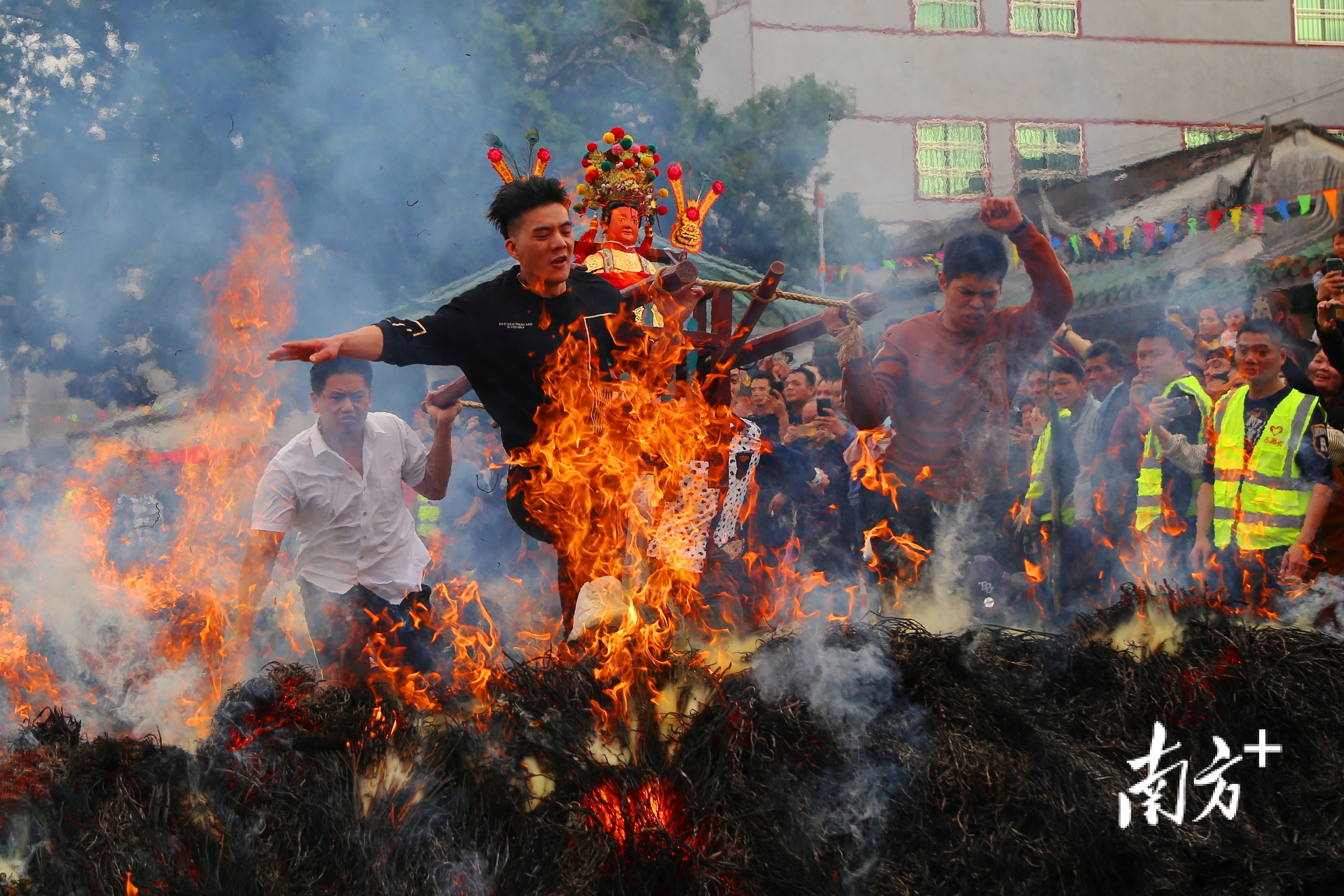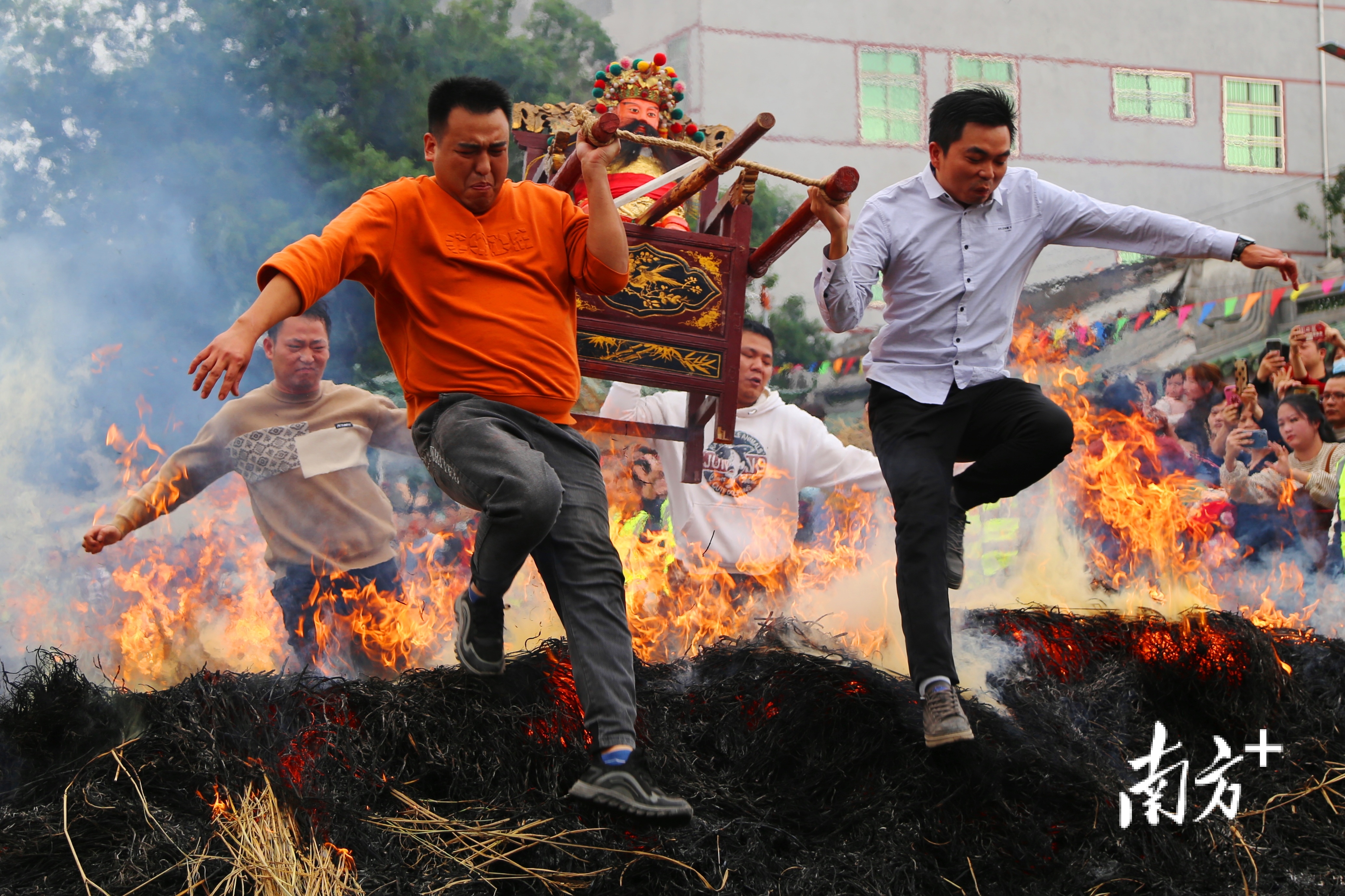 “跳火马”即“跳火堆”,揭阳多地村庄有“跳火堆”的年俗。活动一般在夜间进行,而普宁南溪镇典詹村的“跳火堆”则通常在正月十六下午进行。典詹村“迎老爷”的巡游队伍会依次跳过3个用干稻草点燃的火堆,祈盼新年日子红红火火。