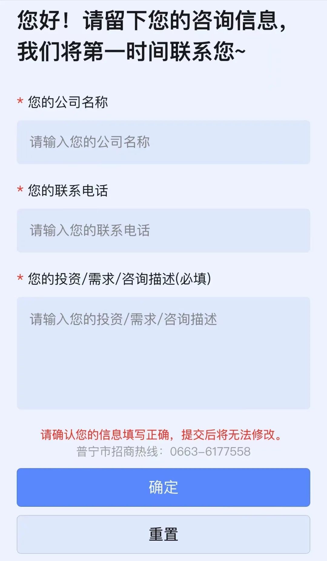 进入“意向填报”交互平台,只需花上一两分钟,填报投资需求,留下咨询信息,马上就有招商工作人员及时跟踪对接,为不同的客户提供精准的服务。