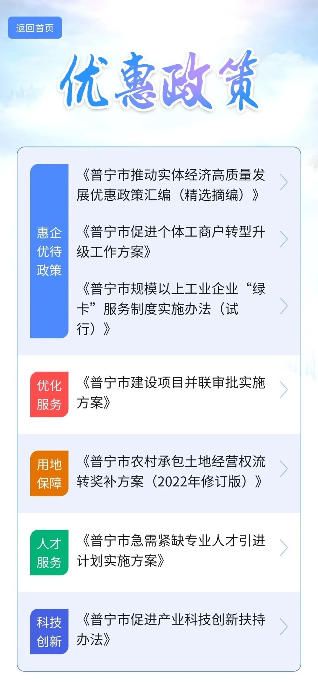 “平台用地”板块从投资者角度出发,清晰展示普宁的产业园区信息、平台发展方向等要素,为投资者“按图索骥”提供精准指引,节省客商的时间成本。“优惠政策”汇集普宁出台的用地保障、人才服务、科技创新等各项“惠企”优待政策,投资者可一屏通览,方便政策红利直达企业。
