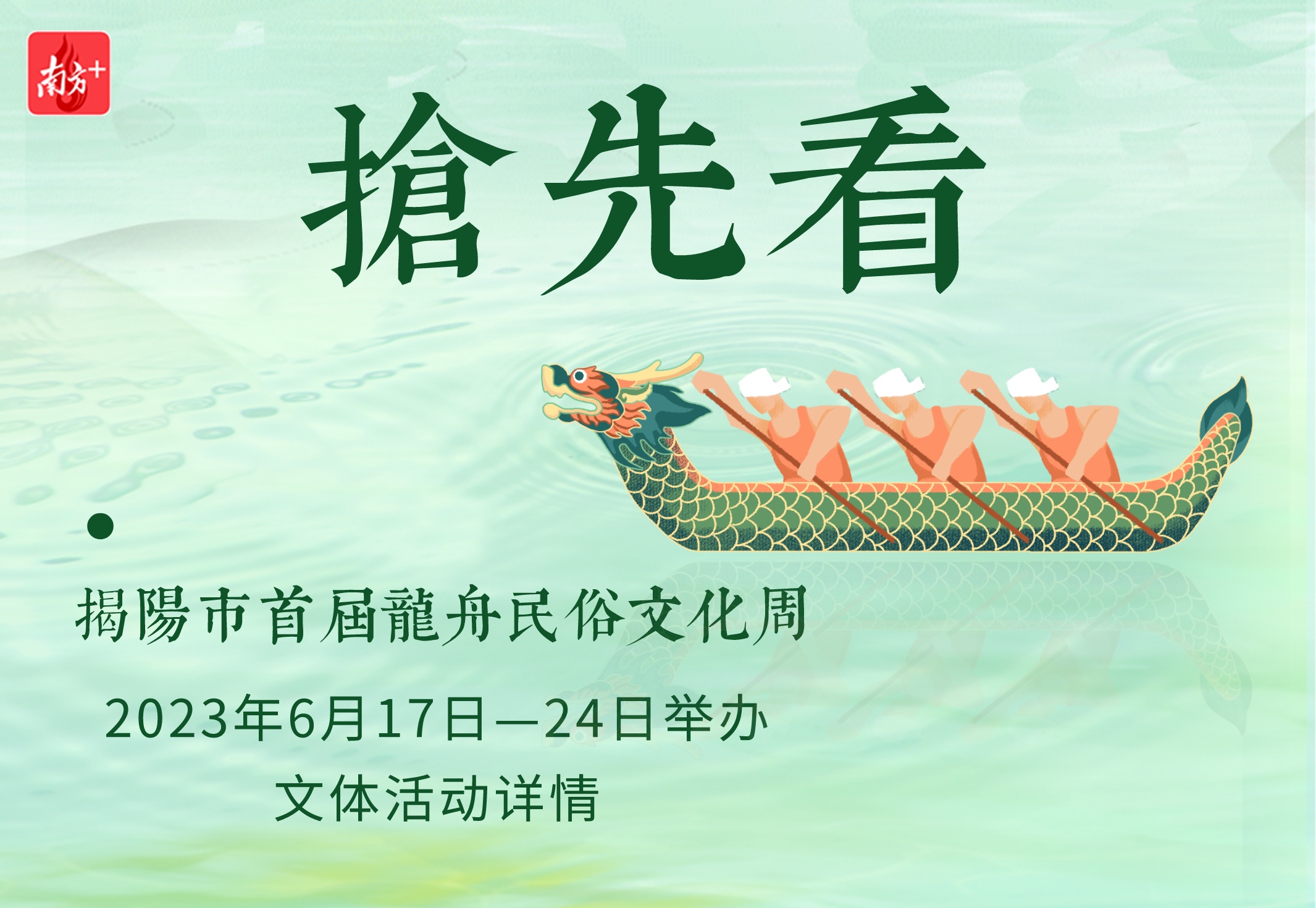 据了解,揭阳赛龙舟2009年10月16日被列入广东省第三批省级非物质文化遗产名录。本次文化周的文体活动地点在榕城区东湖公园、市文化馆、市图书馆、揭阳学宫粤书吧及市博物馆等地举行,广大市民可以沉浸式体验传统文化魅力。