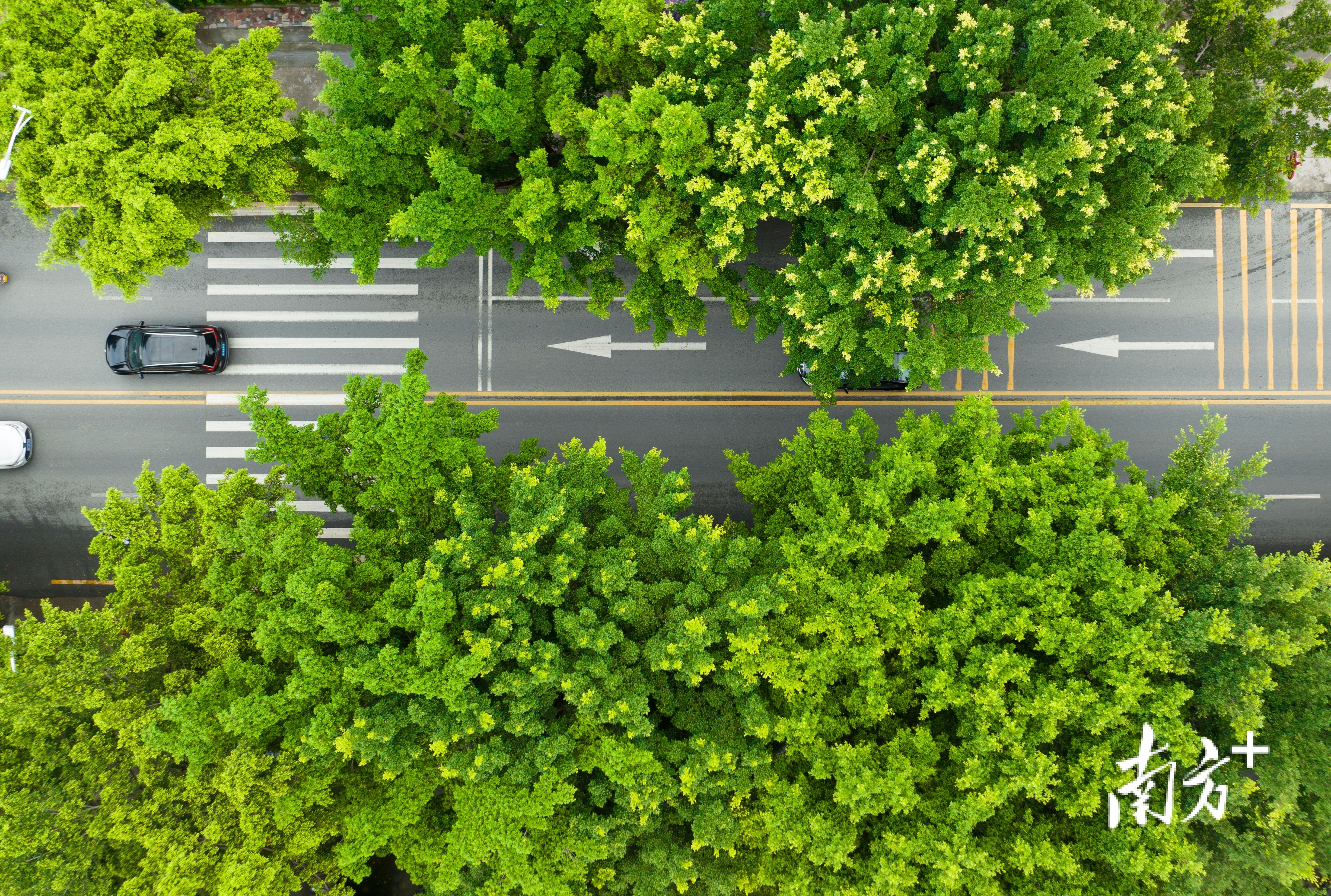 车辆穿梭在绿化中。