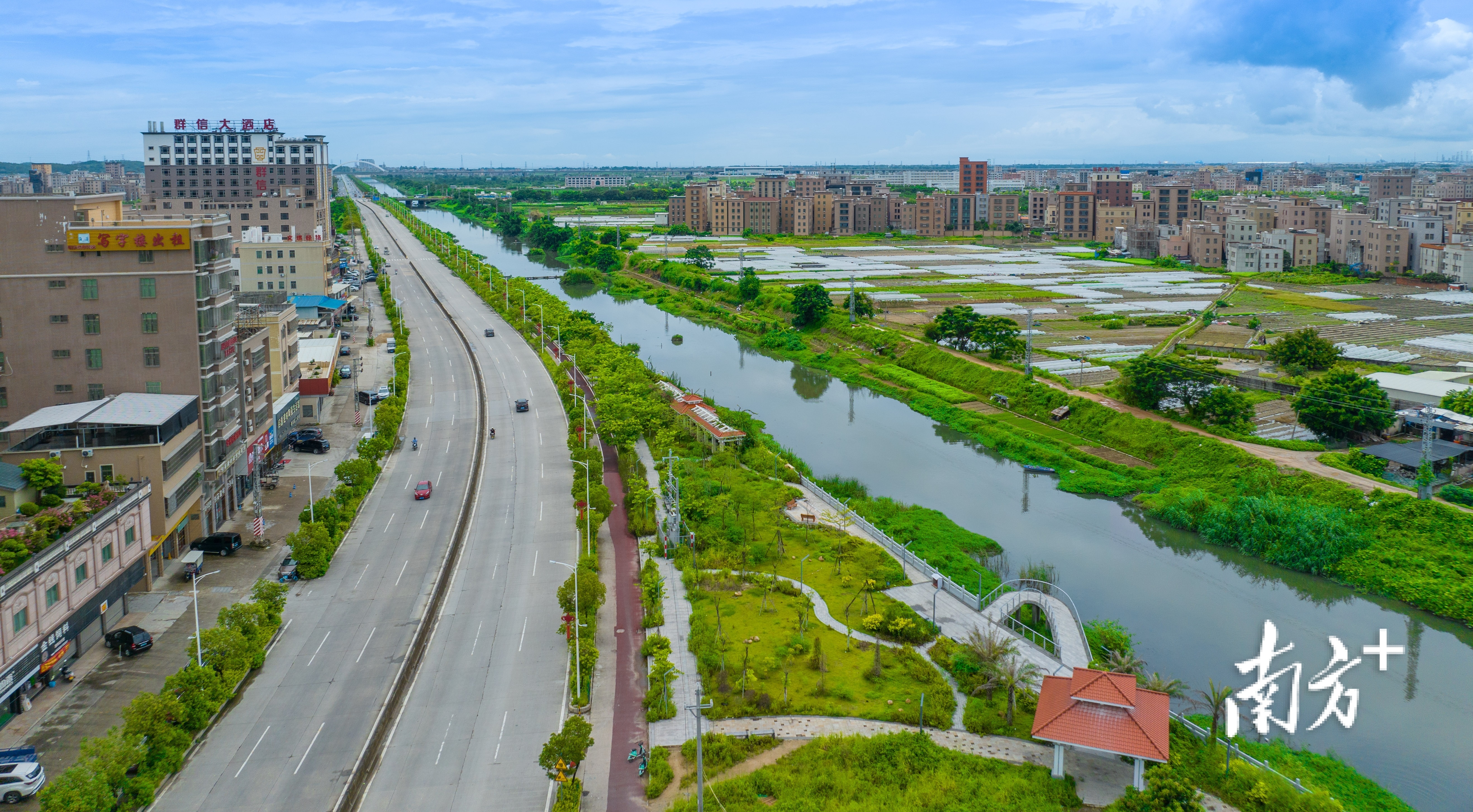 绿化景观带沿河而建,水清岸绿。